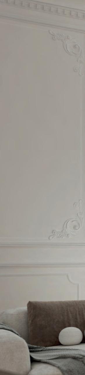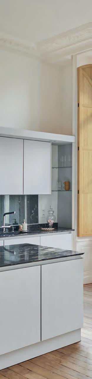 Il est de ces rencontres qui laissent sans voix. C’est ainsi qu’Henry décrit sa première visite dans cet appartement à la splendeur vétuste, mais dont les volumes incroyables et les ornements de style Haussmannien laissent entrevoir une passionnante métamorphose. Dans un camaïeu de tons neutres, l'immense salon baigne désormais dans une lumière douce et réconfortante. L’éclairage est d’ailleurs l’acteur principal de la décoration. Le clair de jour se reflète de part et d’autre des pièces, grâce aux imposantes fenêtres MGL fraîchement rénovées. Entre belles matières, volumes sublimés et superbe luminosité, l’ambiance de ce cocon minimaliste est délicieuse.
