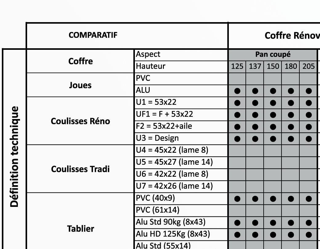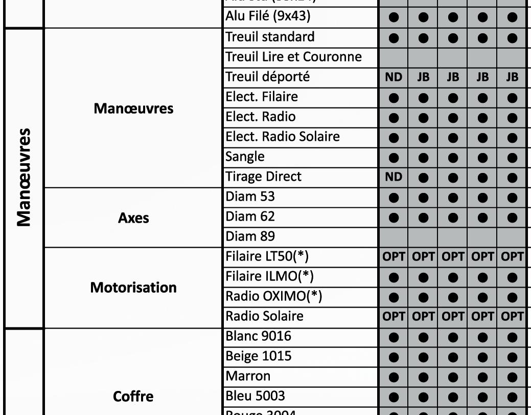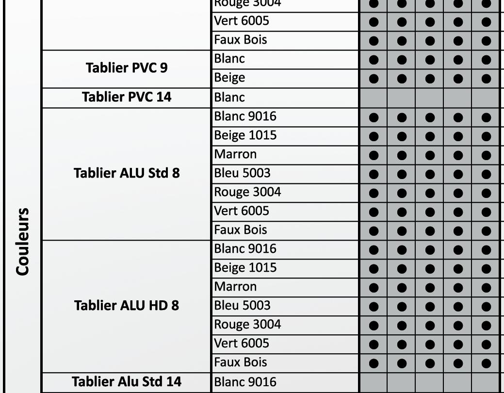 Se référer au comparatif des volets en page 6 pour le détail des disponibilités et compatibilités de coloris