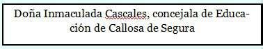 LaÊcolaboraciónÊconÊlaÊConcejalíaÊdeÊEducaciónÊhaÊ sidoÊconstante,ÊtantoÊenÊelÊprocesoÊdeÊmatriculación,ÊenÊ laÊdotaciónÊdeÊespacios,ÊenÊlaÊelaboraciónÊdeÊlaÊofertaÊ educativaÊyÊenÊtodosÊlosÊproblemasÊqueÊsurgenÊenÊelÊdíaÊ aÊdía.ÊNuestroÊagradecimientoÊaÊsuÊtitular,ÊDoñaÊInmaculadaÊCascalesÊyÊaÊPepeÊSarabia,ÊtécnicoÊdeÊlaÊconcejalía,ÊporÊsuÊinterésÊporÊlaÊmarchaÊyÊbuenÊfuncionamientoÊ deÊlaÊescuela.