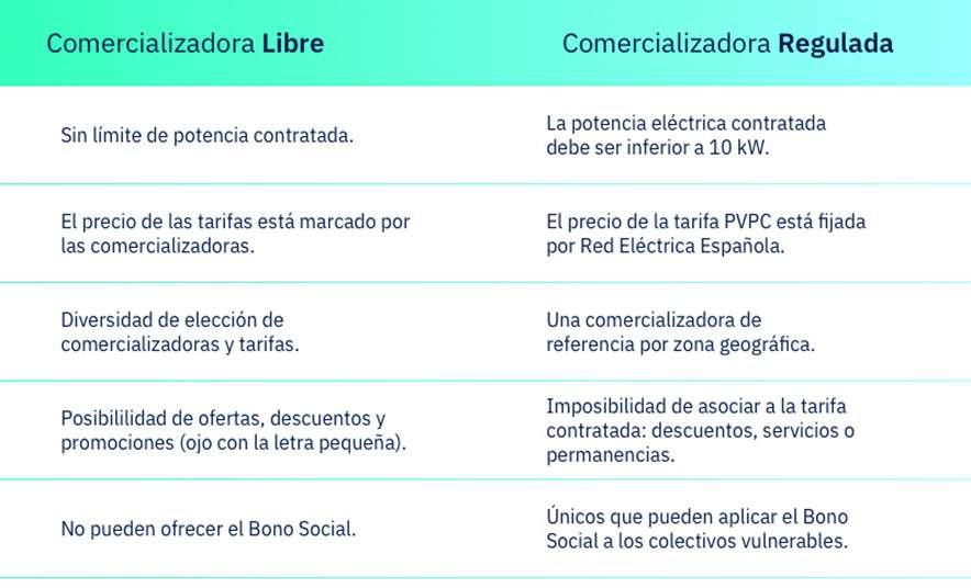 LaÊprincipal diferenciaÊentreÊelÊmercadoÊlibreÊ yÊelÊreguladoÊdeÊlaÊluz esÊcómoÊseÊestableceÊelÊprecioÊdeÊlaÊelectricidad.ÊEnÊelÊmercadoÊregulado,Ê elÊprecioÊcambiaÊcadaÊhoraÊtodosÊlosÊdíasÊmientrasÊqueÊenÊelÊlibreÊestáÊestablecidoÊporÊlasÊcomercializadoras.ÊElÊmercadoÊreguladoÊcuentaÊconÊelÊ precioÊvoluntarioÊalÊpequeñoÊconsumidor,ÊconocidoÊcomoÊtarifaÊPVPCÊoÊregulada.ÊLosÊpreciosÊestánÊdeterminadosÊporÊelÊMinisterioÊdeÊIndustria,ÊEnergíaÊyÊTurismo. TambiénÊseÊconoceÊcomoÊtarificaciónÊporÊhoras,ÊyaÊqueÊelÊprecioÊcambiaÊcadaÊhora. CadaÊdíaÊseÊestablecenÊ24ÊpreciosÊdistintos, segúnÊlaÊdemanda,ÊhaciendoÊqueÊlasÊfacturasÊseanÊmuyÊvariablesÊaÊloÊlargoÊdeÊlasÊsemanas. LaÊcantidadÊ deÊcompañíasÊdelÊsectorÊreguladoÊesÊlimitada.
