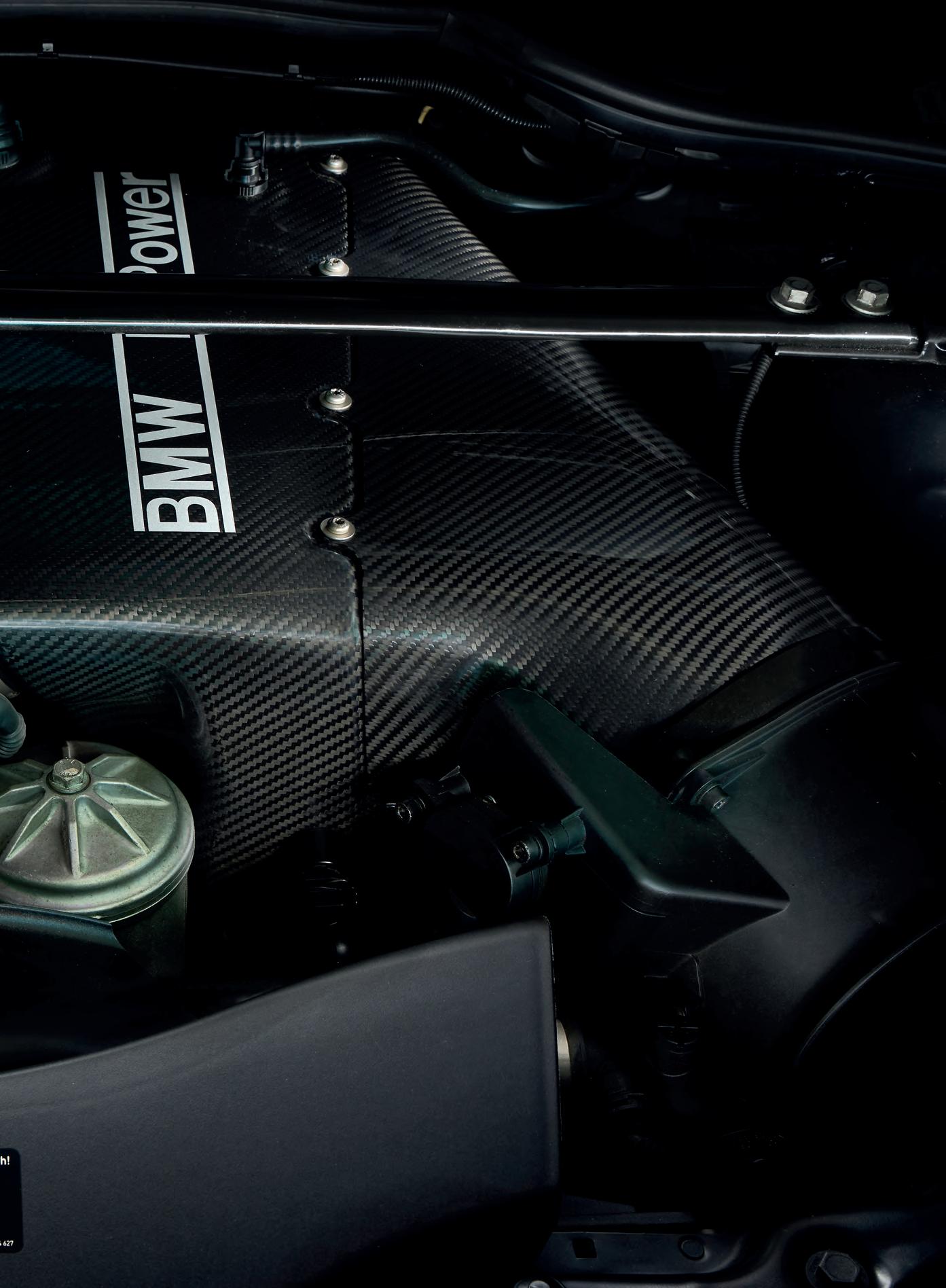 In the preparation of the new CSL, they decided to do away with everything that is not essential for driving and that, by its presence, adds even one kilo to the weight of the car. Jeremy Clarkson said the boot liner was made of cardboard, which is not true. What is true, however, is that the designers took all pains to keep the final weight of the M3 CSL E46 as low as possible. Thus, in the 21st century, in the middle of Europe, they created a car without any radio, air conditioning and electrically adjustable seats to slim this BMW car down wherever possible. As a result, one seat here weighs only eighteen kilograms – standard sport seats from M3 over thirty. The roof and door trims are made of carbon, and the boot lid of plastic. The bonnet (with its characteristic bulge) is aluminium, and the rear window is thinner than standard. These and other measures reduced the weight of the car by approximately 100 kg. Under the bonnet it still had the 3.2 litre engine, but this time they squeezed not 343 but 355 hp out of it.