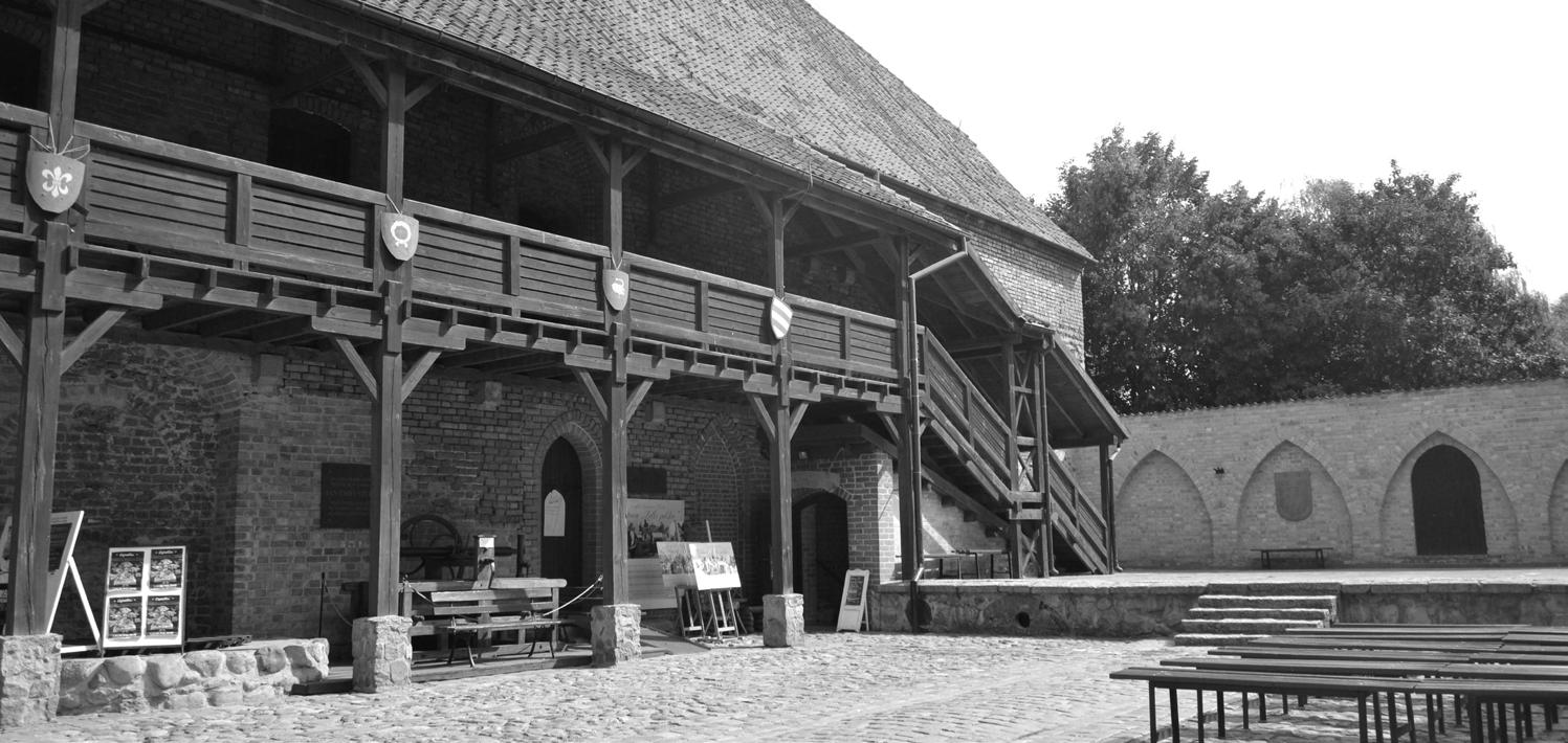i bramne w kształcie ostrołuków, a na dziedzińcu odkryto studnię i odtworzono drewniany krużganek przy skrzydle północnym.