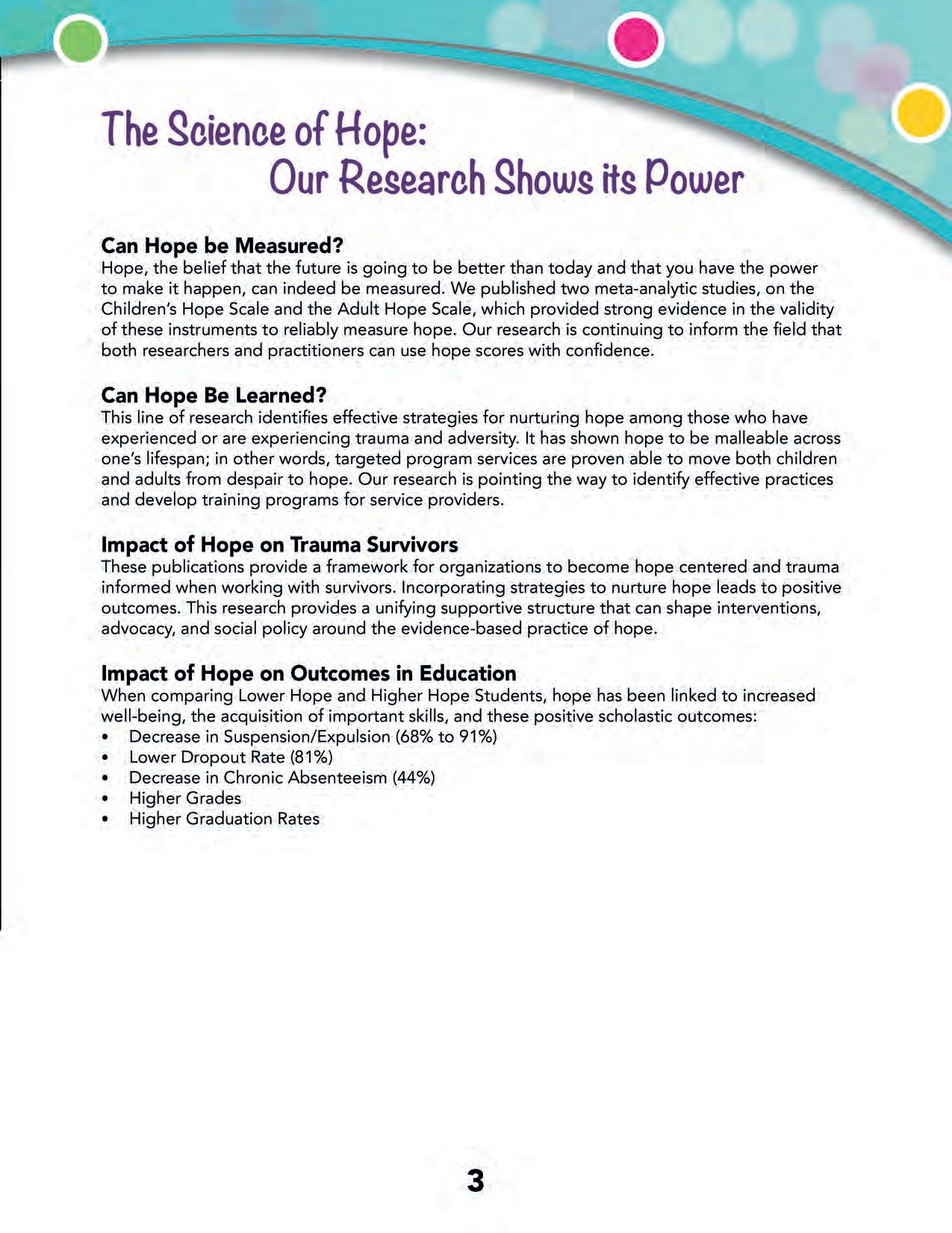 The simplicity of hope is that it is teachable and, therefore, measurable. Hope is the ability to set goals, identify the pathways to achieve those goals, and the capability to dedicate the mental energy (agency) to acting on those pathways and reaching your set goals. Hope is not wishful thinking; rather, hope is about taking action to pursue your goals.