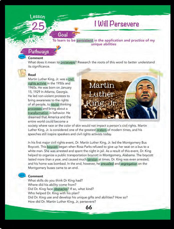 Comment: Students will use the workbook questions to guide them in thinking about what it takes to refine their gifts and talents and use them for good. Feel free to use the questions as a guide for a student-led discussion.