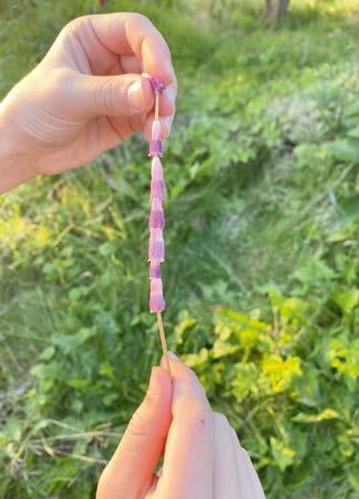 Beinwellblüten werden auf einen Grashalm aufgefädelt. Ein filigraner Blütenschmuck und gleichzeitig eine Feinmotorikübung.