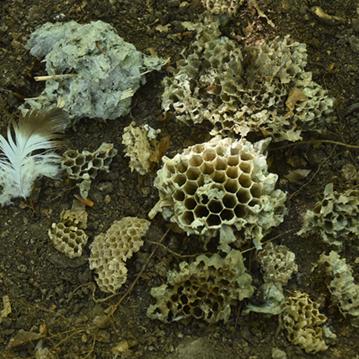 Reste von Waben unter einem Horst des Wespenbussards sowie eine Deckfeder von der Art. Die Rückschlüsse auf den Horstnutzer sind hier eindeutig.