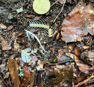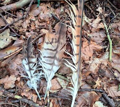 Rupfungsreste unter einem Habichthorst. Deutlich sind die blauen »Spiegelfedern« des Eichelhähers zu erkennen.