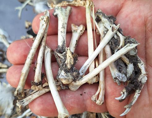 Knochen von Krähen, Kolkrabe, Mäusebussard und Tauben aus zerfallenem Uhugewölle.