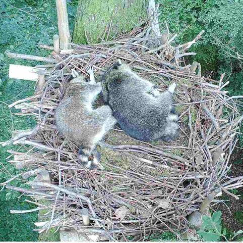 Auch Waschbären nutzen Nester von Großvogelarten des Waldes. Hier haben sie einen Schwarzstorchhorst okkupiert.