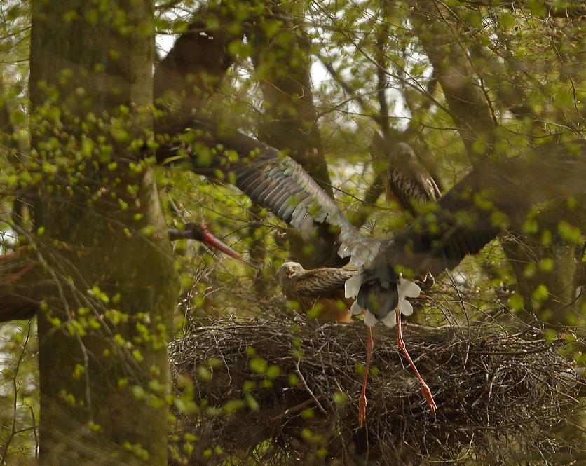 Geeignete Brutplätze sind in unseren Wäldern auf Grund der spezifischen Ansprüche der Arten nicht leicht zu finden. In diesem Beispiel »entbrennt« ein Kampf um den Brutplatz. Rotmilane haben den Horst der Schwarzstörche besetzt, werden aber erfolgreich von den »Waldstörchen« vertrieben.