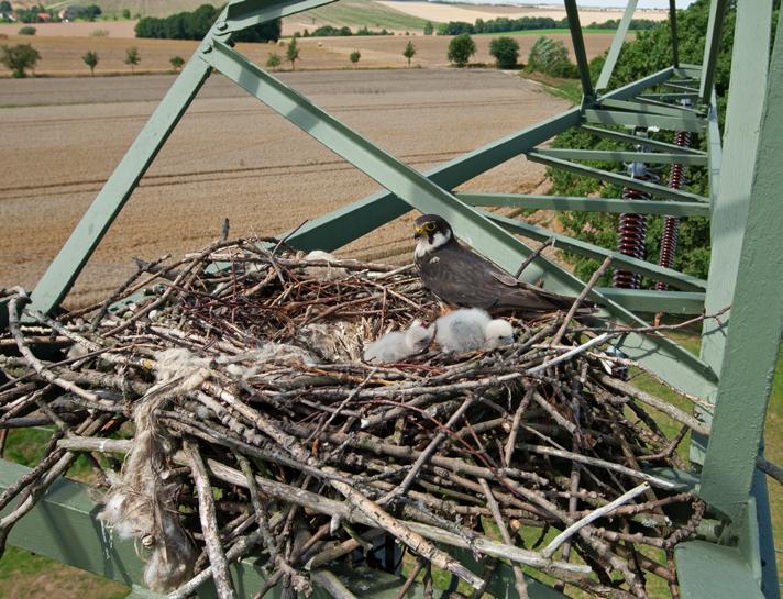 In der Regel nutzen Baumfalken verlassene Nester von Rabenkrähen, die von diesen auf Kiefern oder Fichten an lichten, sonnenexponierten Waldrändern gebaut wurden, zum Brüten. Aber auch Krähennester auf Strommasten von Hochspannungsleitungen werden zum Brüten genutzt. Hier war der Horstbauer ein Kolkrabe. Dies ist gut an den dicken Ästen zu erkennen, die von ihm verbaut wurden. Mauserfedern sind in der Regel nicht unter den Brutplätzen zu finden und liefern somit keinen Hinweis auf den HorstNachnutzer.