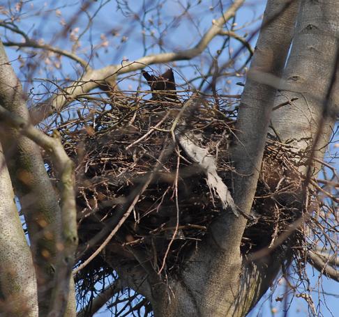 Ganz typisch für die hoch in der Krone von Überhältern angelegten, kleinen Horste ist der eingebaute Plastikmüll. Häufig finden sich dort Folienreste, Bindegarn und Lumpen. In der Brutzeit ragt in der Regel der deutlich gegabelte Schwanz über den Horstrand.