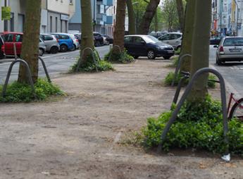 Wanderbäume sind temporäre Installationen in der Stadt, die in kurzen Abständen die Positionen wechseln und so ermöglichen, verschiedene Standorte »auszuprobieren«. Die Idee ist nicht neu - bereits in Dortmund-Hörde hat es so etwas gegeben und auch das iResilience-Projekt hat in Köln-Deutz bereits Erfahrungen mit einer Wanderbaumallee gesammelt. Wichtig ist, die möglichen Standorte vorab mit der Feuerwehr und den entsprechenden Ämtern abzustimmen, um nur Bäume an Orten zu testen, an denen eine Realisierung auch denkbar wäre. Die Rettungswege müssen ebenso beachtet werden, wie auch tiefliegende Leitungen und Kanäle. Außerdem gilt es die richtige Baumart, am besten eine hei-