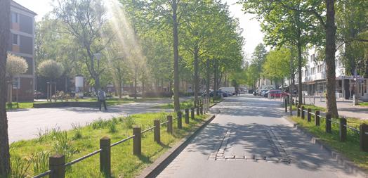 > wenig straßenbegleitendes Grün; junge Bäume mit noch eingeschränktem ökologischem Wert