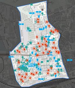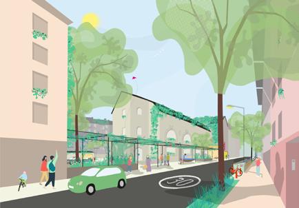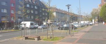 Einige Straßenzüge wie bspw. Kesselstraße oder Blumenstraße im südlichen Teil des Hafenquartiers oder Mozartund Haydnstraße am nördlichen Rand wurden im Rahmen der »KlimaMap Dortmund Hafenquartier« im Jahr 2020 als heiße Orte gekennzeichnet. Tatsächlich befinden sich in diesen Straßen keine Bäume, die für Schatten oder Verdunstungskühle sorgen könnten. Im Hinblick auf eine zeitgemäße Straßenraumgestaltung, wären Bäume jedoch wünschenswert, um den Auswirkungen des Klimawandels entgegenzuwirken. Um geeignete Standorte zu finden, wären wandernde, vorübergehende Bäume denkbar.