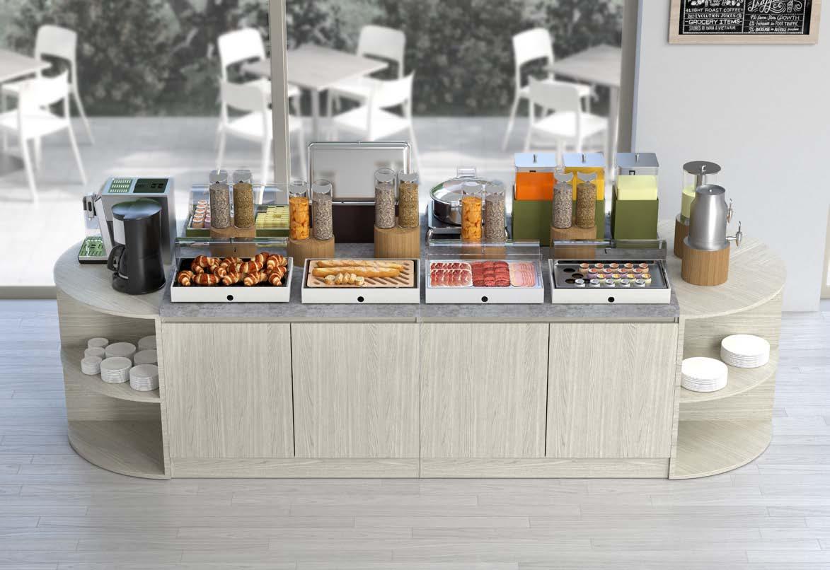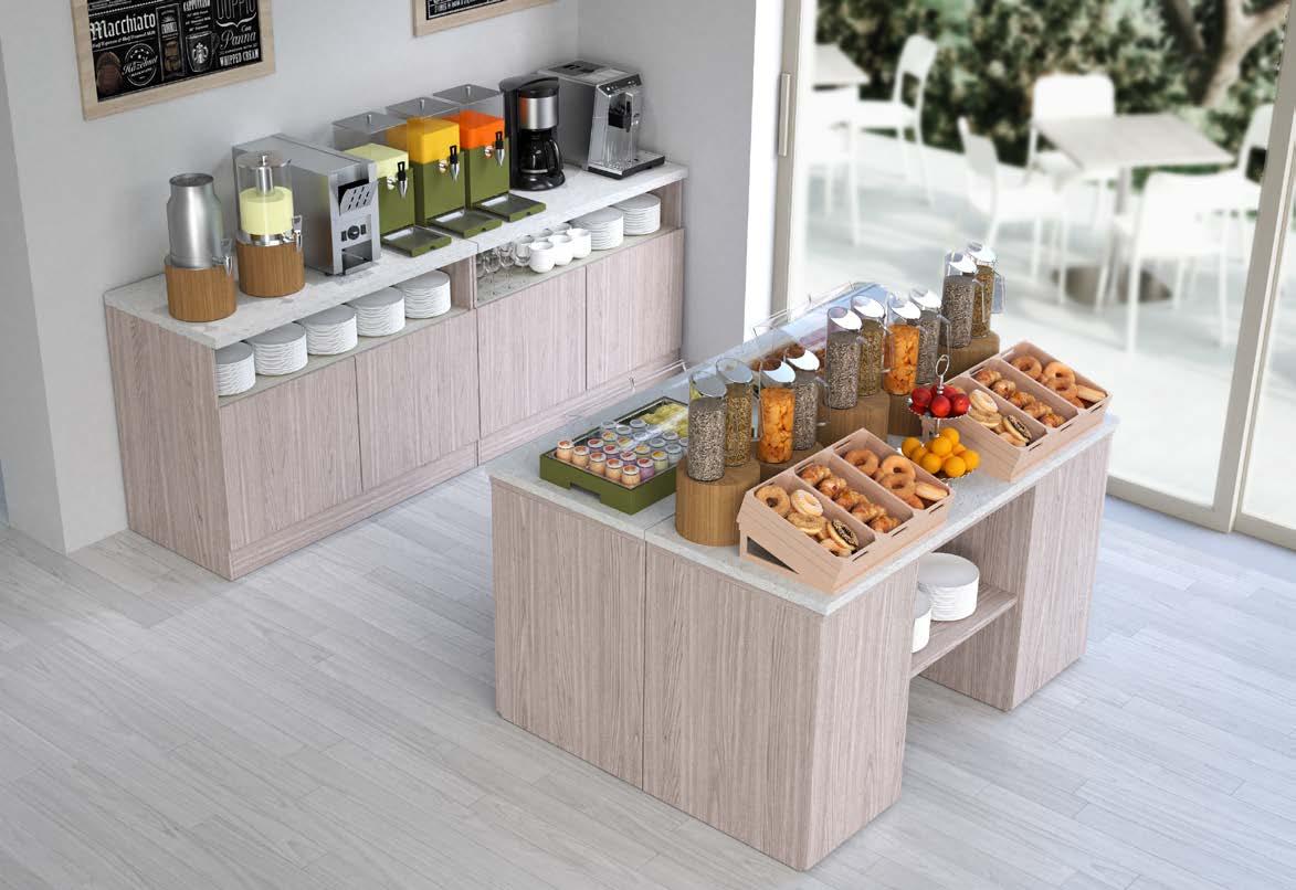 Buffet composto da un'isola centrale e un elemento lineare a parete.