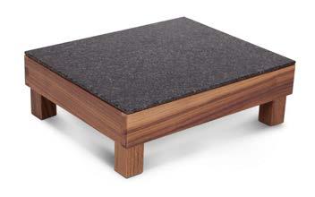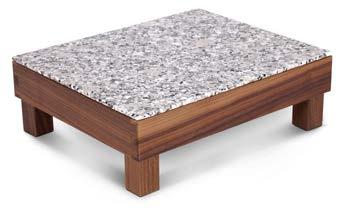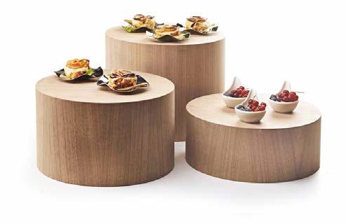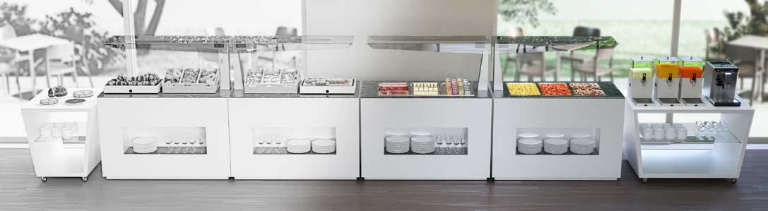 Buffet centrale che consente una fruizione circolare. Ideale per valorizzare pareti vetrate di una sala o semplicemente per agevolare il buffet creando un percorso. Realizzato con 4 mobili cod. 30590 affiancati ed accoppiati e 4 mobili cod. 11878 affiancati.