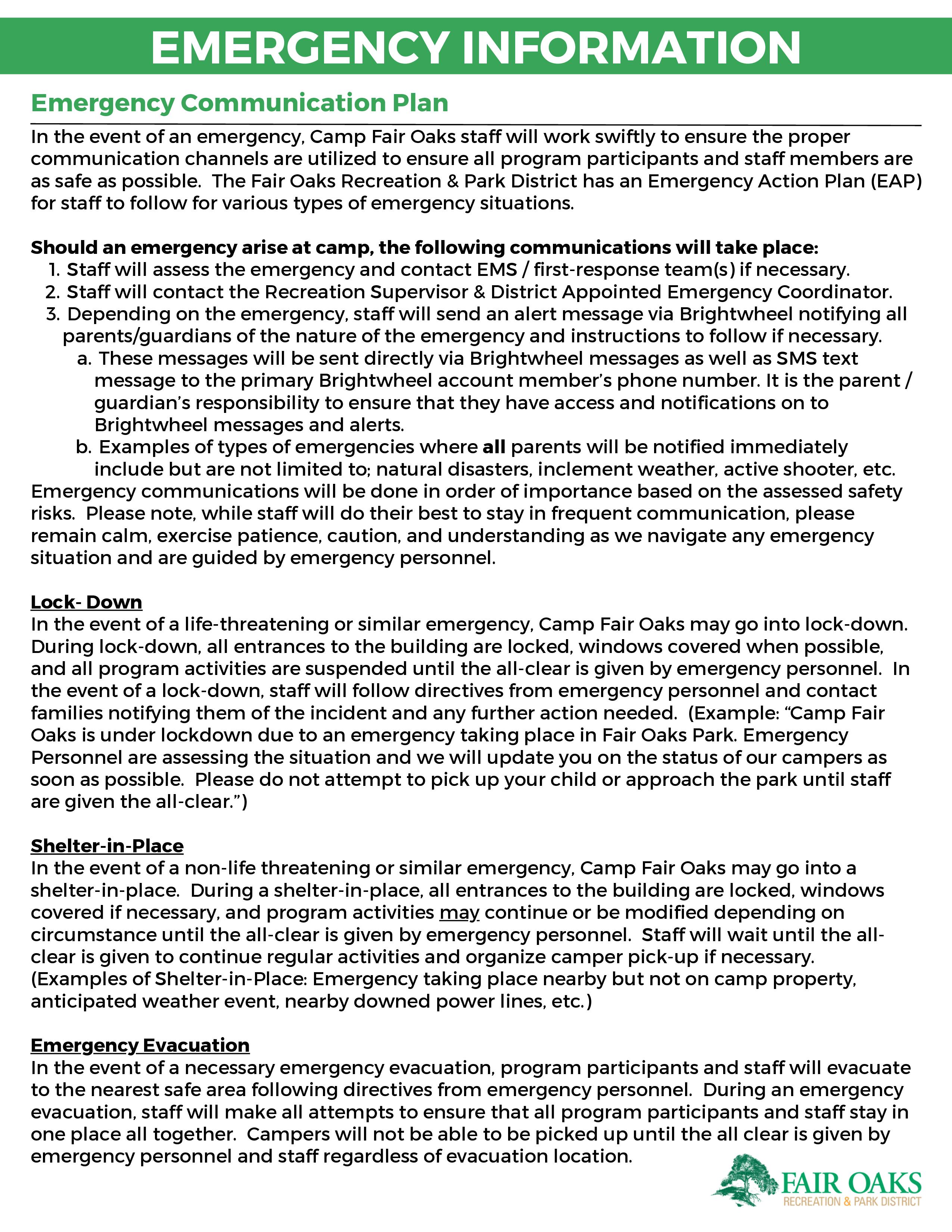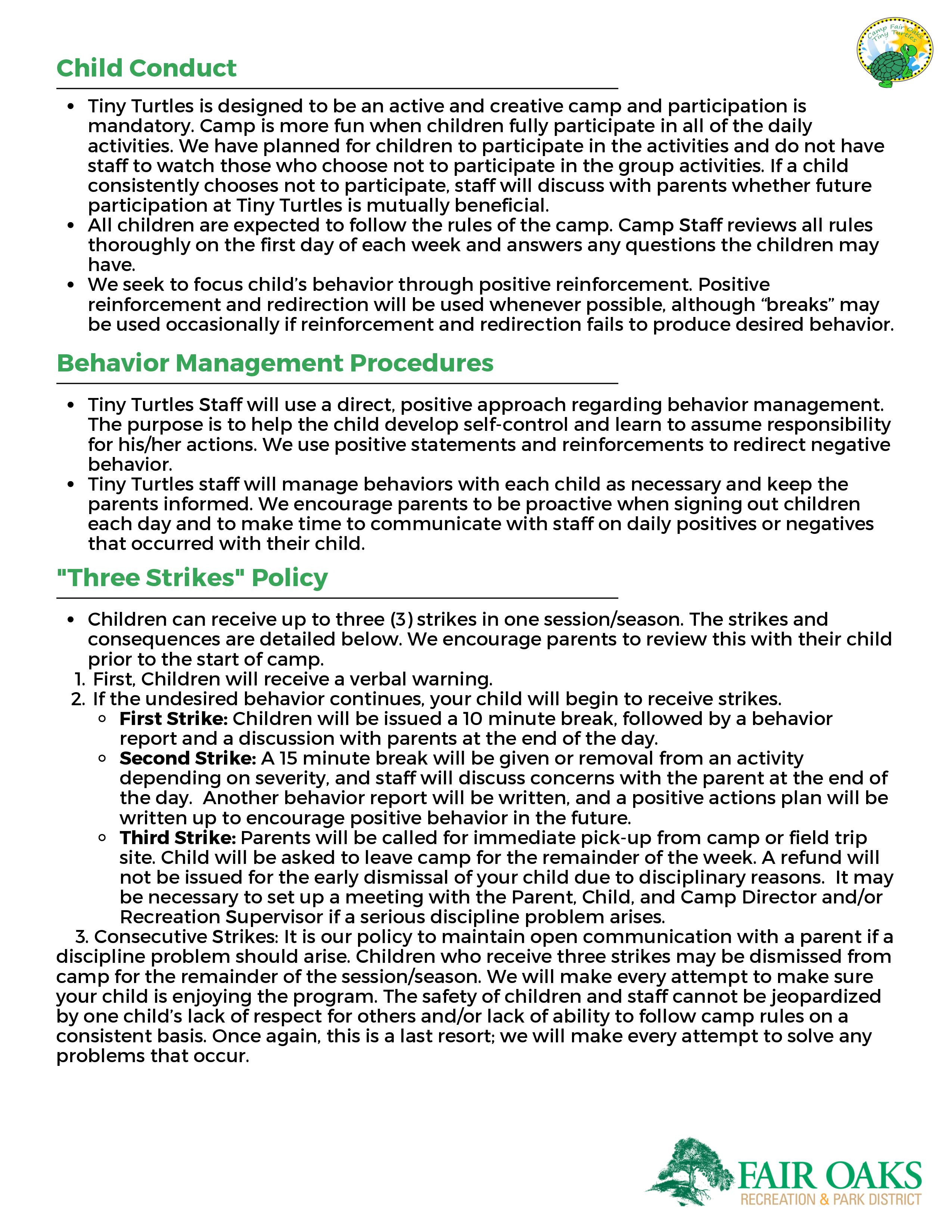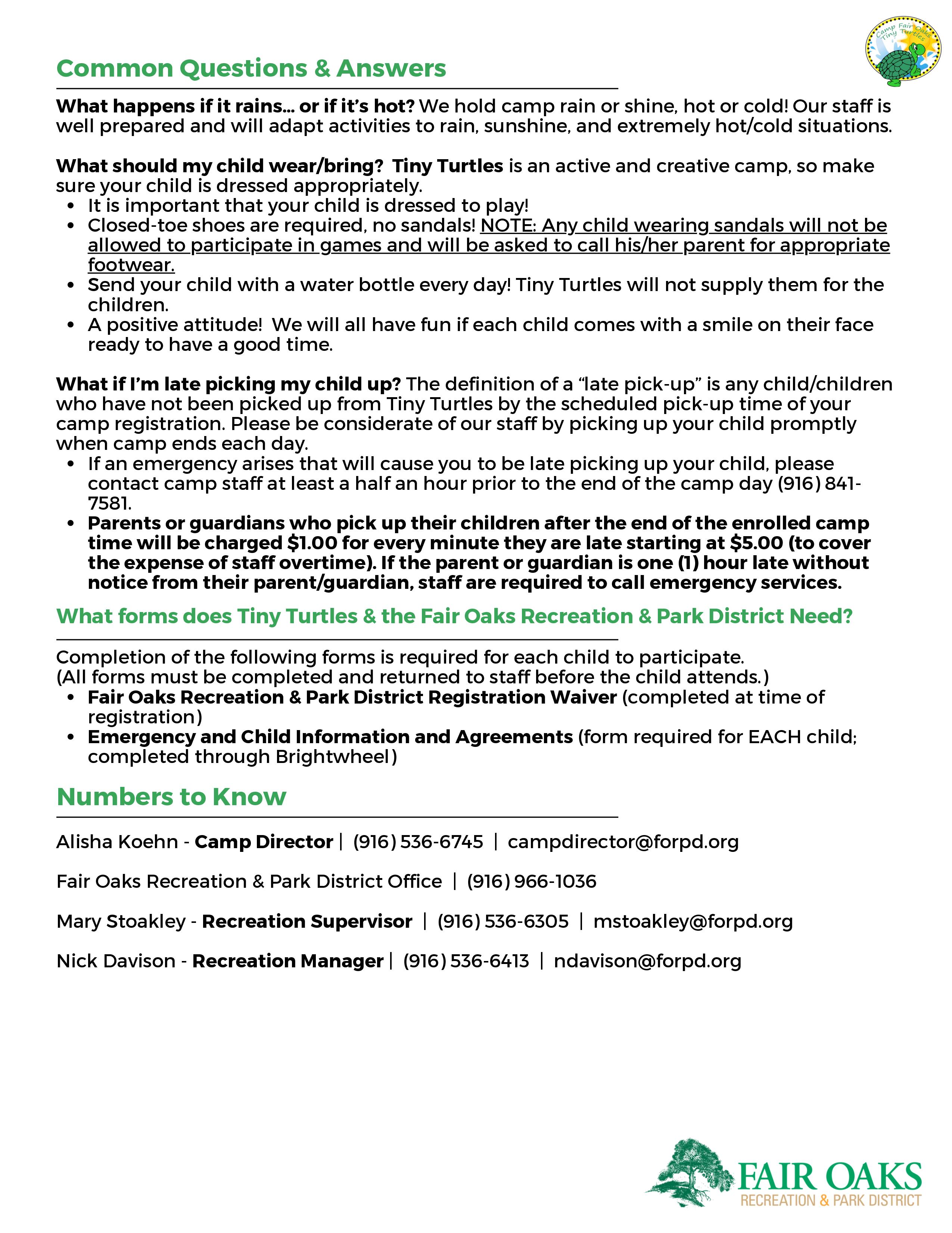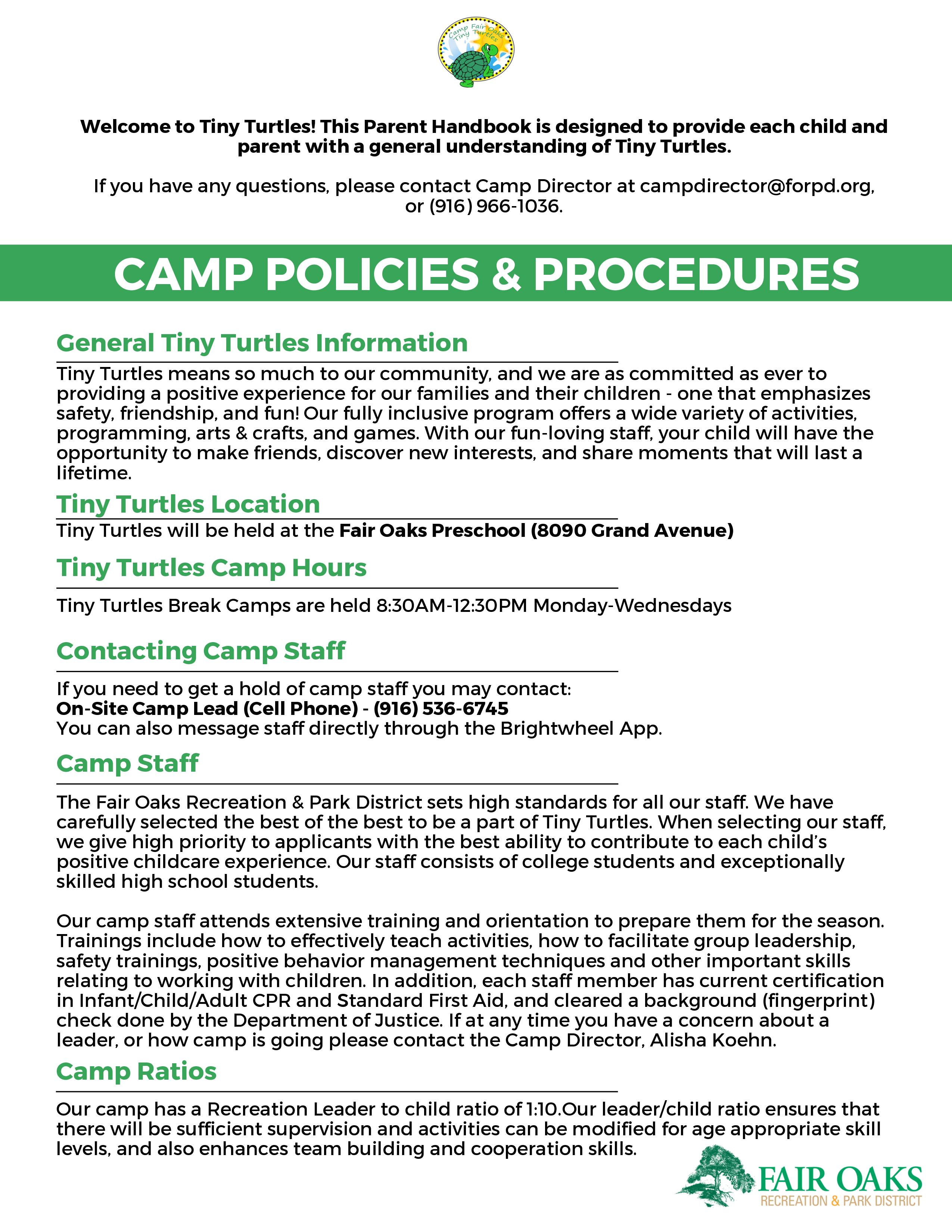 Review the details of Camp Fair Oaks Tiny Turtles in our Parent Handbook!