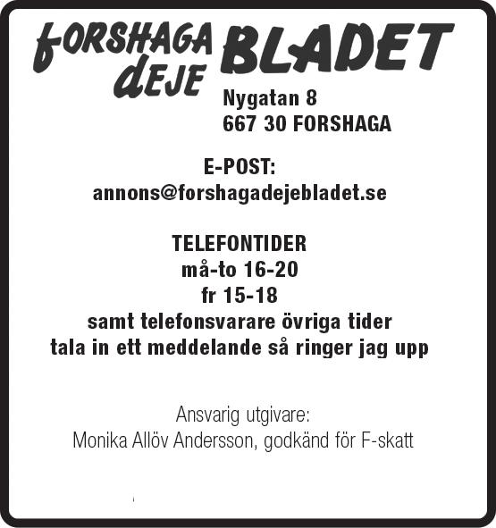 forshagadejebladet.se Tel: 0707997827 Årgång 52 2022 Onsdag 7 dec nr 42, vecka 49 Julmarknader på Rotnäs J u l m a r k n a d m e d u t s t ä l l a r e i l a d a n d ä r j u l m u s i k e n f l ö d a r . C a f é t o c h b u t i k e n ä r ö p p e t s o m v a n l i g t ! 10 dec & 17 dec 11.00-16.00 R o t n ä s g å r d 4 0 7 , K a r l s t a d | r o t n a s g a r d s b u t i k @ b o d e s i g n . s e 0 7 0 6 7 8 3 4 0 0 | w w w r o t n a s g a r d s b u t i k s e Söndag 11 dec "Musik i Advent" Uppträdande: Charlotte Gustavsson 12:00 & 14:00, pris: 50: /person Din Bilhandel vid Bergvik i Karlstad Köpvägen 1, 653 46 Karlstad Tel: 054 - 56 56 70