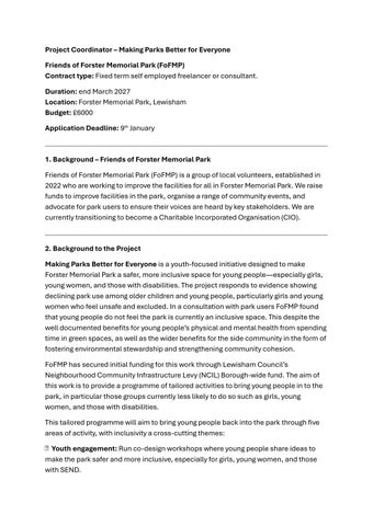 The Project Coordinator will be responsible for coordinating the delivery of activities across the 5 themes over the 14-month period within the agreed budget. This will include developing the programme of events in consultation with the FOFMP, an existing girls' design group, and other key stakeholders. The programme should cover the areas outlined above and should target diverse groups including girls, young women, disabled young people, and those from marginalised backgrounds. Ensuring activities are tailored to enable full participation across all groups will be a priority.