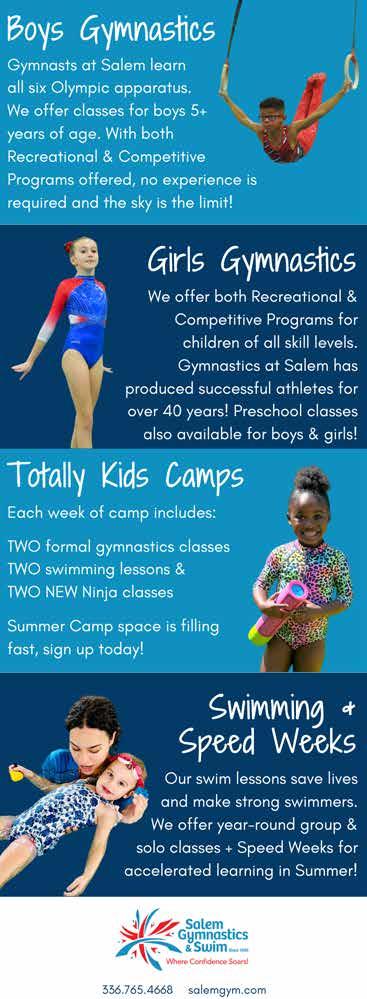 Salem Gymnastics & Swim. Go for Olympic gold at Salem Gymnastics! Join us as we follow (Salem Style) Team USA this summer in Paris. Participate in individual and team sports, play theme related games, make crafts and learn about Paris: the “City of Lights.” Totally Kids Camp is from 9am2pm with an optional add-on until 5pm. Camp Imagination is offered for 3-5-yearolds every week from 9am-12pm with the option to stay for lunch bunch.
