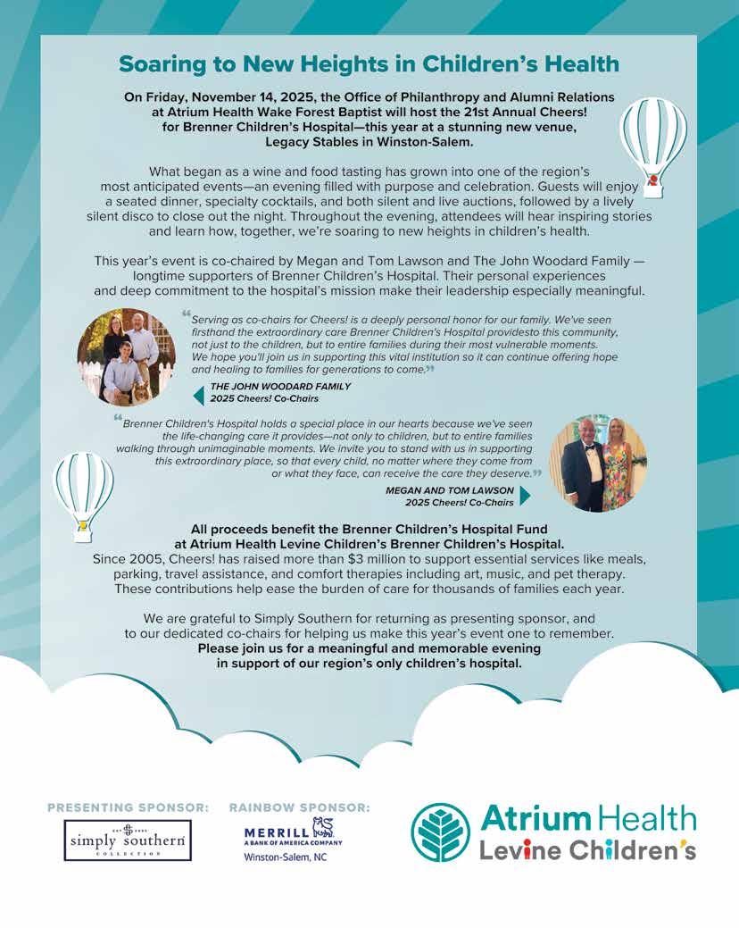 We’ve also got some exciting community events coming up! The Ronald McDonald Character Breakfast is happening Saturday, October 25th—scan the QR code on page 33 to snag your tickets. And mark your calendars for CHEERS! for Brenner Children’s Hospital on Friday, November 14th at Legacy Stables & Events. Learn more about this incredible fundraiser on page 34.