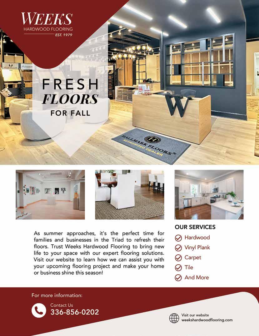 You’ll love a visit to the Weeks Hardwood Flooring showroom at 7901 Thorndike Road in Greensboro where you’ll meet some of the professionals who’ll be handling your home project and be able to browse every stylish option for your floors. Call them at 336.856.0202 to arrange your free in-home consultation and estimate, and follow them online at weekshardwoodflooring.com. Find them on Facebook and Instagram @weekshardwoodflooring where you can see new product updates and creative ideas to revitalize your home for the holidays! Showroom hours are Monday through Friday 8 am – 5 pm and Saturday, 9 am – 1 pm.