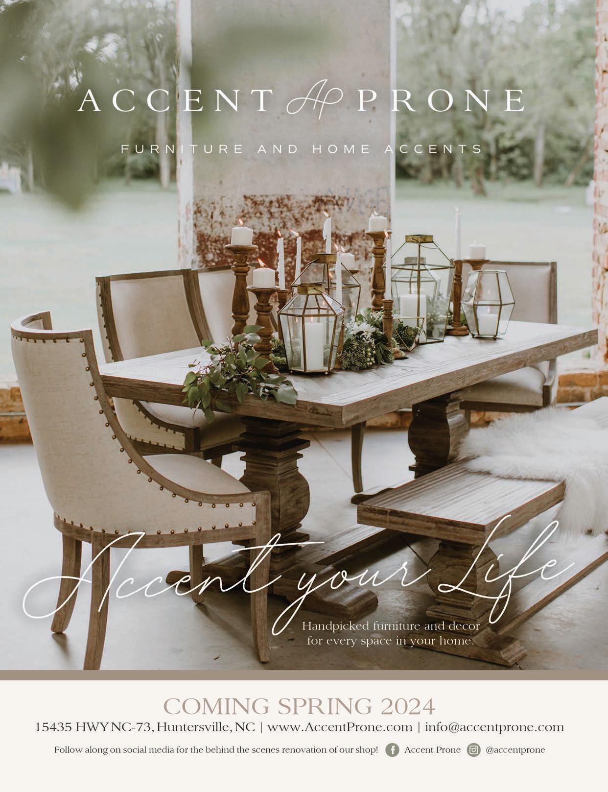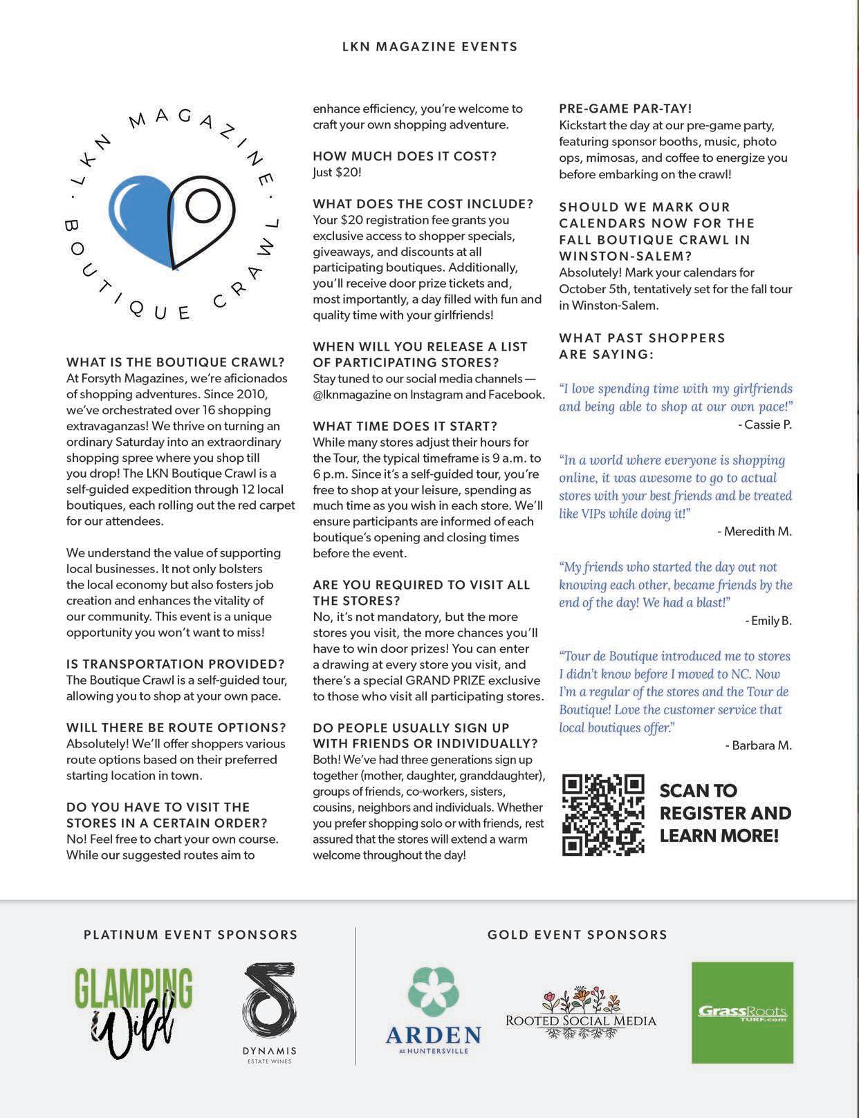 Get ready for an exciting event – the Boutique Crawl on Saturday, April 27th! Dive into the details on page 64. I guarantee, joining us for this delightful occasion will soon become a cherished annual or bi-annual tradition. Our Spring Boutique Crawl in Lake Norman presents the perfect opportunity to explore and find your summer favorites. And don't forget to mark your calendars for October when we collaborate with Forsyth Woman Magazine for the Fall Boutique Crawl, formerly known as our Tour de Boutique.