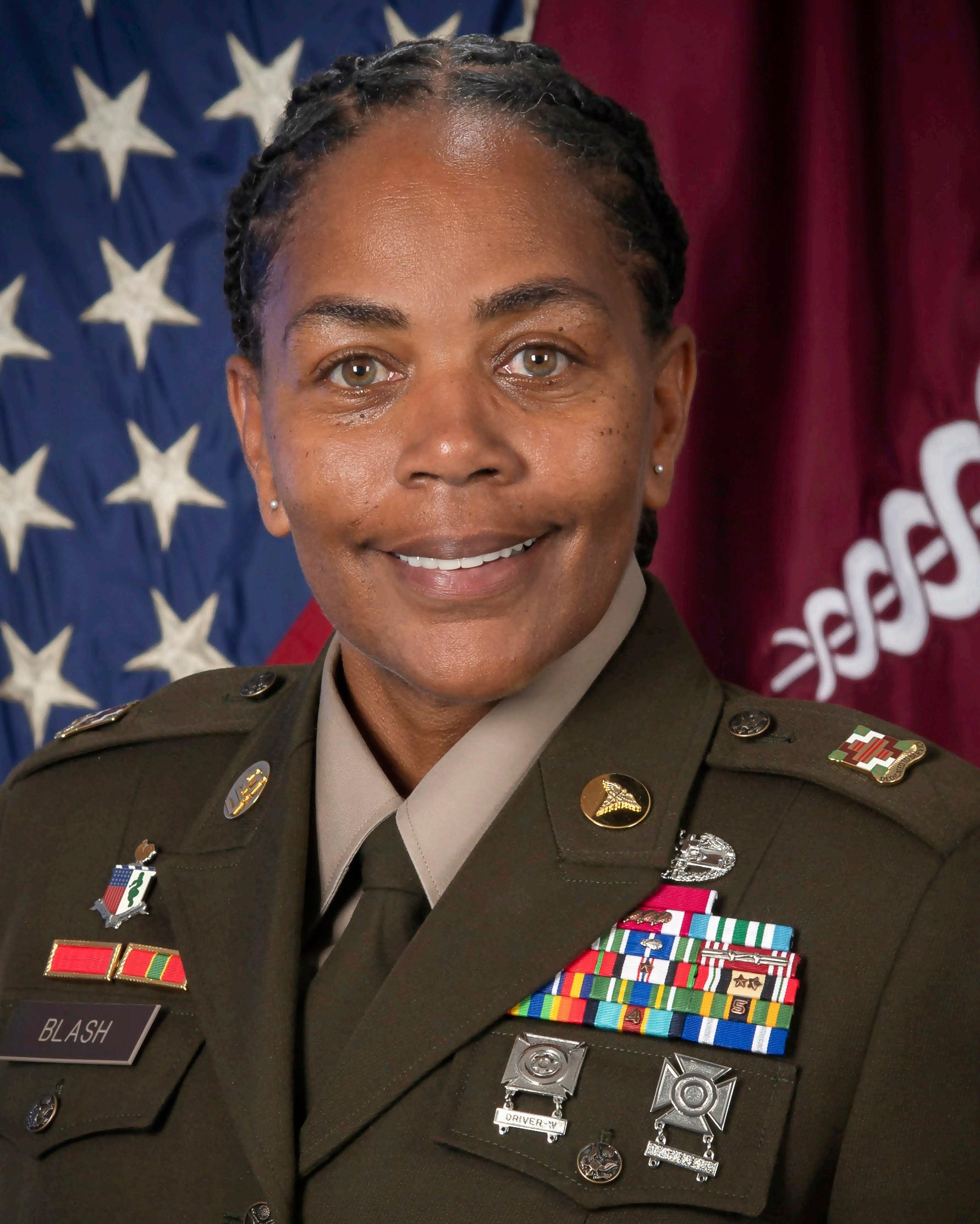 Command Sgt. Maj. Blash operational deployments include Iraq in support of OIF I and Operation Enduring Freedom in Afghanistan. Her awards and decorations include the Legion of Merit; Bronze Star Medal; Meritorious Service Medal, 6th Award; Army Commendation Medal, 8th Award, Joint Service Achievement Medal, Army Achievement Medal, 6th Award; Army Good Conduct Medal, 7th; Iraq Campaign Medal, National Defense Service Medal, Korea Defense Service Medal; Global War on Terrorism Service Medal; Global War on Terrorism Expeditionary; NATO Medal, Noncommissioned Officer Professional Development Ribbon with numeral 5; Army Service Ribbon; Overseas Service Ribbon with a numeral 4, Meritorious Unit Award, Drill Sergeant Badge and Combat Medical Badge.