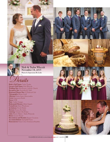 Bride’s Full Name: Taylor Tondre Groom’s Full Name: Nick Wleczyk Wedding Site: Holy Rosary Catholic Church Reception Site: Needville KC Hall Rehearsal Dinner Site: Ol’ Railroad Cafe Videography: Rhyne Acuff Officiant: Father Jamie Abercrombie Gown: Impression Bridal Shoes: DSW Hair: Visible Changes Bridesmaid Dresses: Alfred Angelo Formalwear: Men’s Wearhouse Invitations: David’s Bridal Flowers: Flowers By Adela Catering: Schulze’s Bar-B-Que Cake: Bessie’s Bakery - Kathy Warnecke Music: Jeannie Bryant Decorations and Rentals: Elegant Occasions Accommodations: SpringHill Suites Honeymoon: Punta Cana, Dominican Republic
