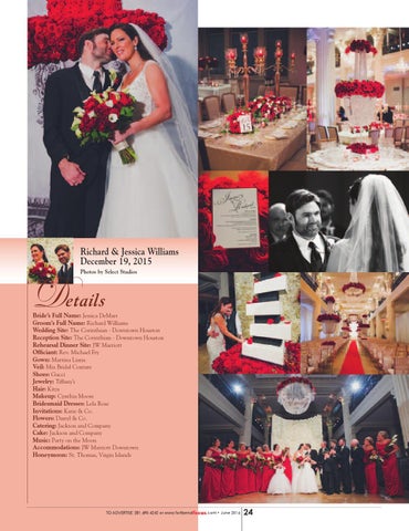 Bride’s Full Name: Jessica DeMarr Groom’s Full Name: Richard Williams Wedding Site: The Corinthian - Downtown Houston Reception Site: The Corinthian - Downtown Houston Rehearsal Dinner Site: JW Marriott Officiant: Rev. Michael Fry Gown: Martina Liana Veil: Mia Bridal Couture Shoes: Gucci Jewelry: Tiffany’s Hair: Kitza Makeup: Cynthia Moore Bridesmaid Dresses: Lela Rose Invitations: Katie & Co. Flowers: Darryl & Co. Catering: Jackson and Company Cake: Jackson and Company Music: Party on the Moon Accommodations: JW Marriott Downtown Honeymoon: St. Thomas, Virgin Islands