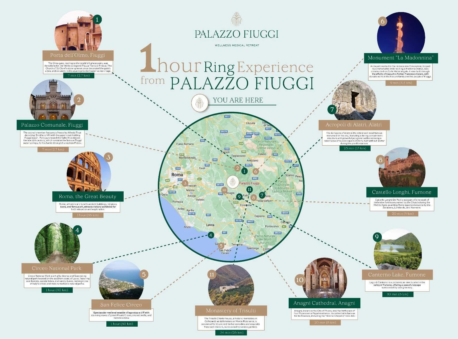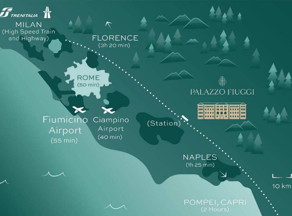Located fifty minutes drive from Rome, Palazzo Fiuggi has exceptional transport links, including the fast train from Milan, and a choice of international airports just one hour away.
