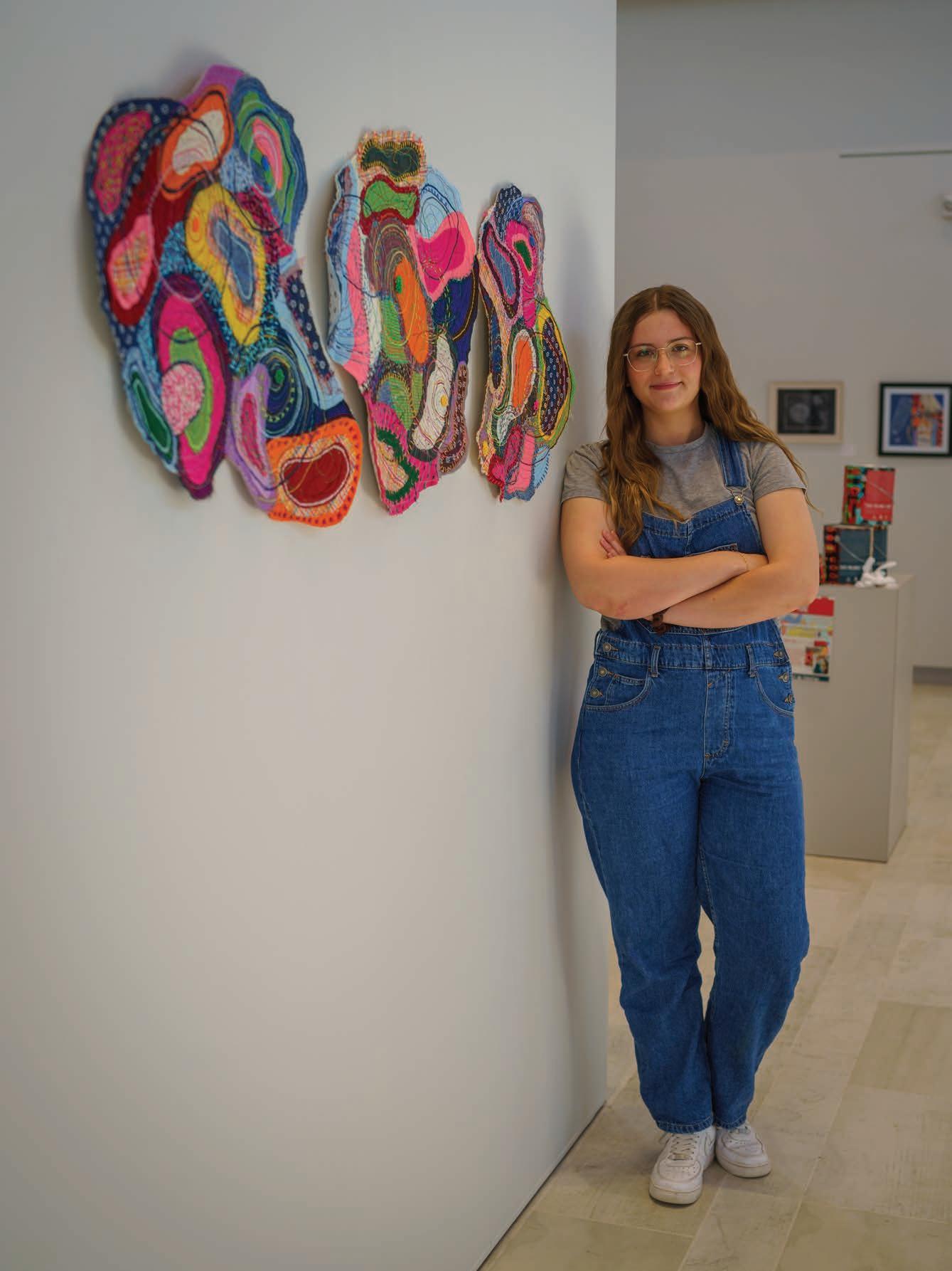 Madison Gleason, a graduate from Larned, Kansas, recently completed her bachelor of fine arts in studio art with an emphasis in drawing. With a penchant for repurposed fabrics and a dedication to sustainability, Madison creates visually striking pieces that give a new life to discarded materials. Her artwork has graced esteemed exhibitions, including the Student Honors Exhibition, and has garnered recognition through various awards and scholarships. Through her work with fibers, Madison invites viewers to experience a profound connection to the world around us.