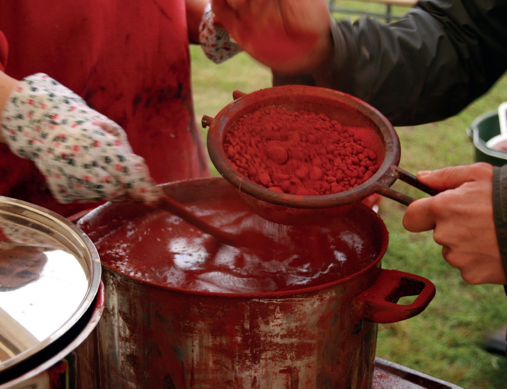 Komposisjonsmaling kokes i en gryte og røde pigmenter tilsettes gjennom en sikt. Foto: Fortidsminneforeningen/ Ola Fjeldheim