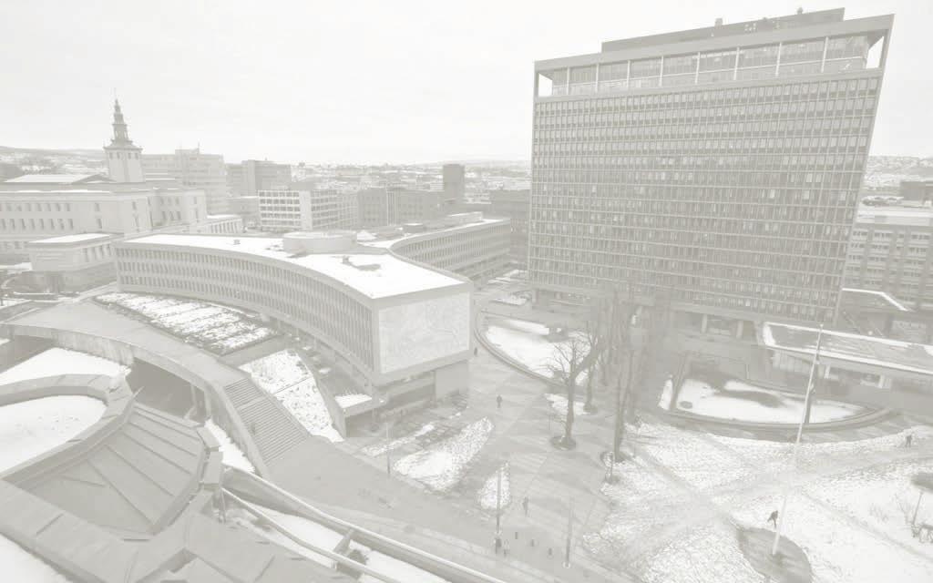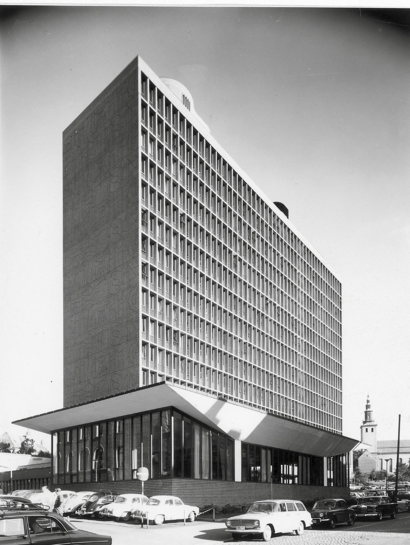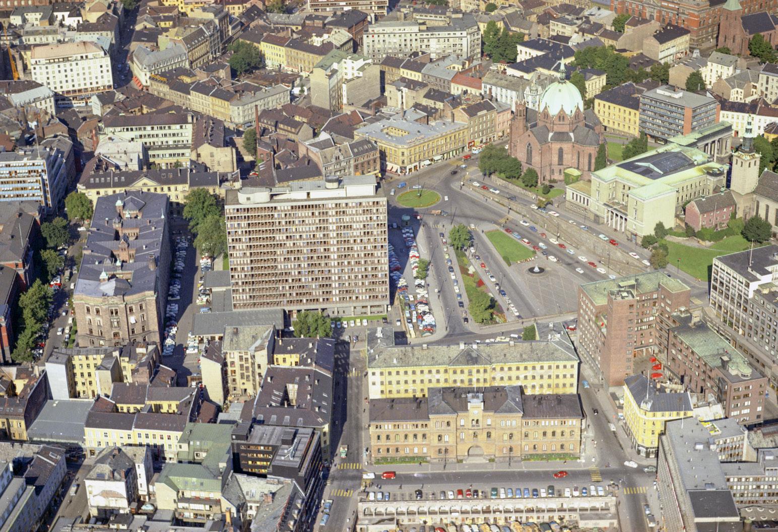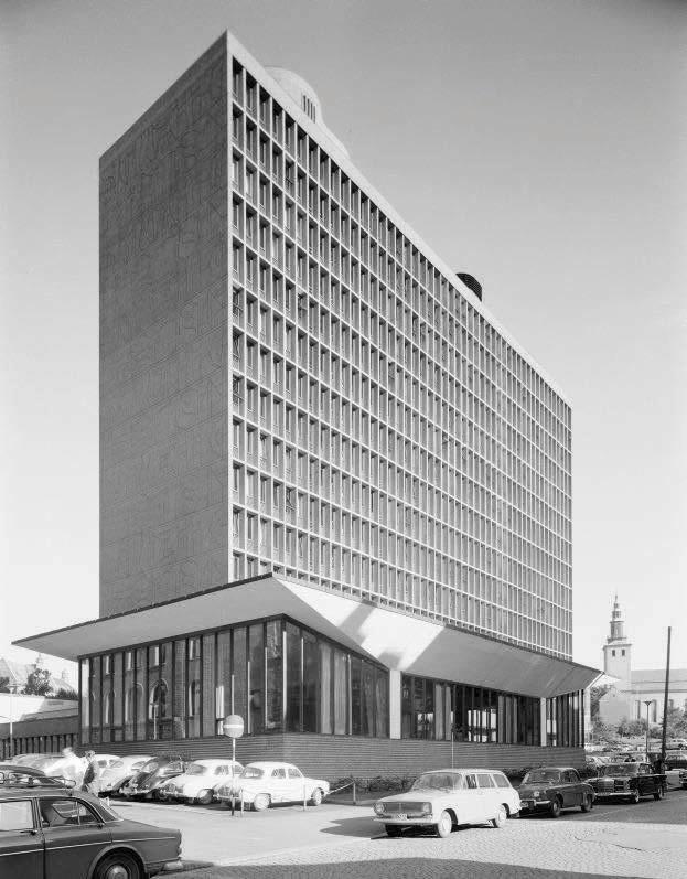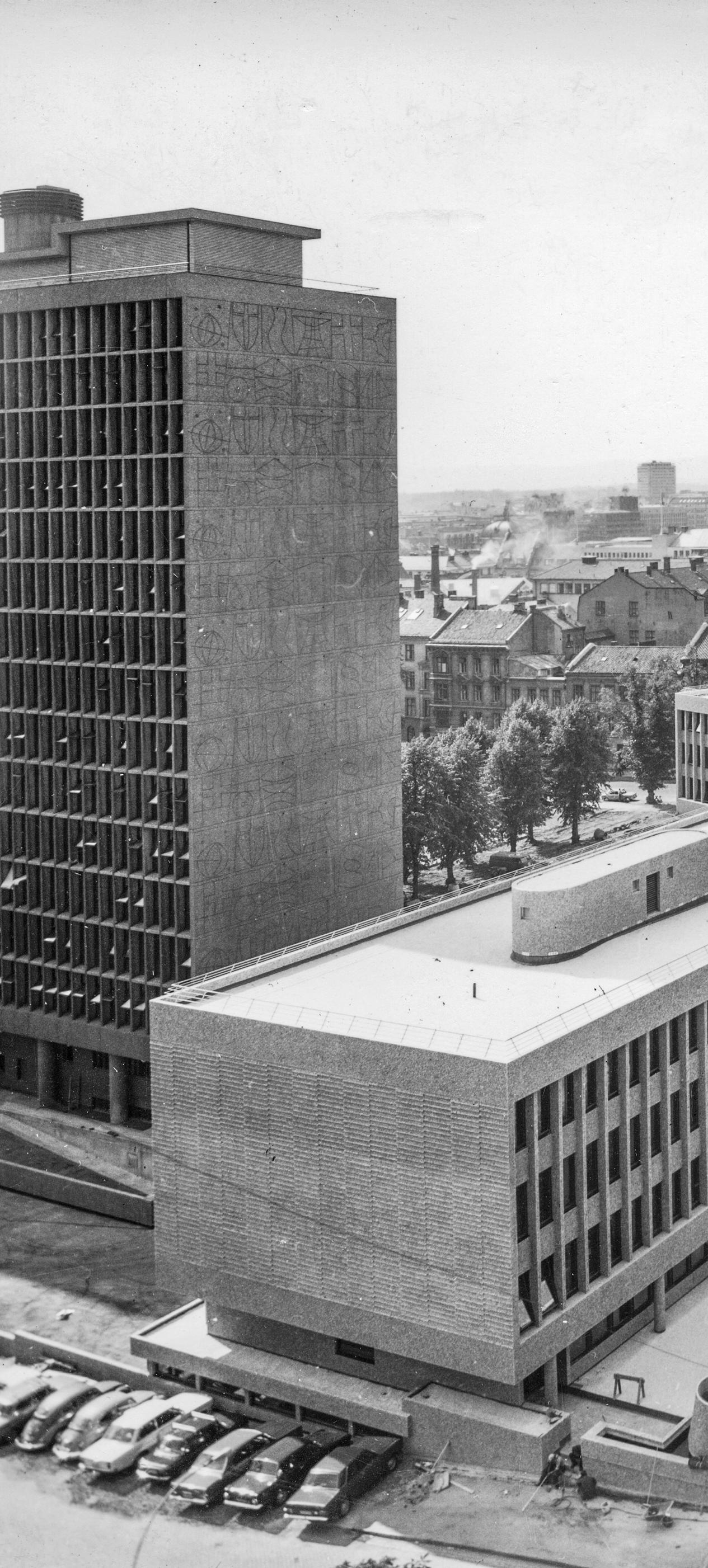 Forsidebilde: Y-blokken og Høyblokken, tegnet av arkitekt Erling Viksjø. Perspektiv fra Deichmanske hovedbibliotek på Hammersborg. Foto: Teigens fotoatelier/DEXTRA Photo, Teknisk museum.