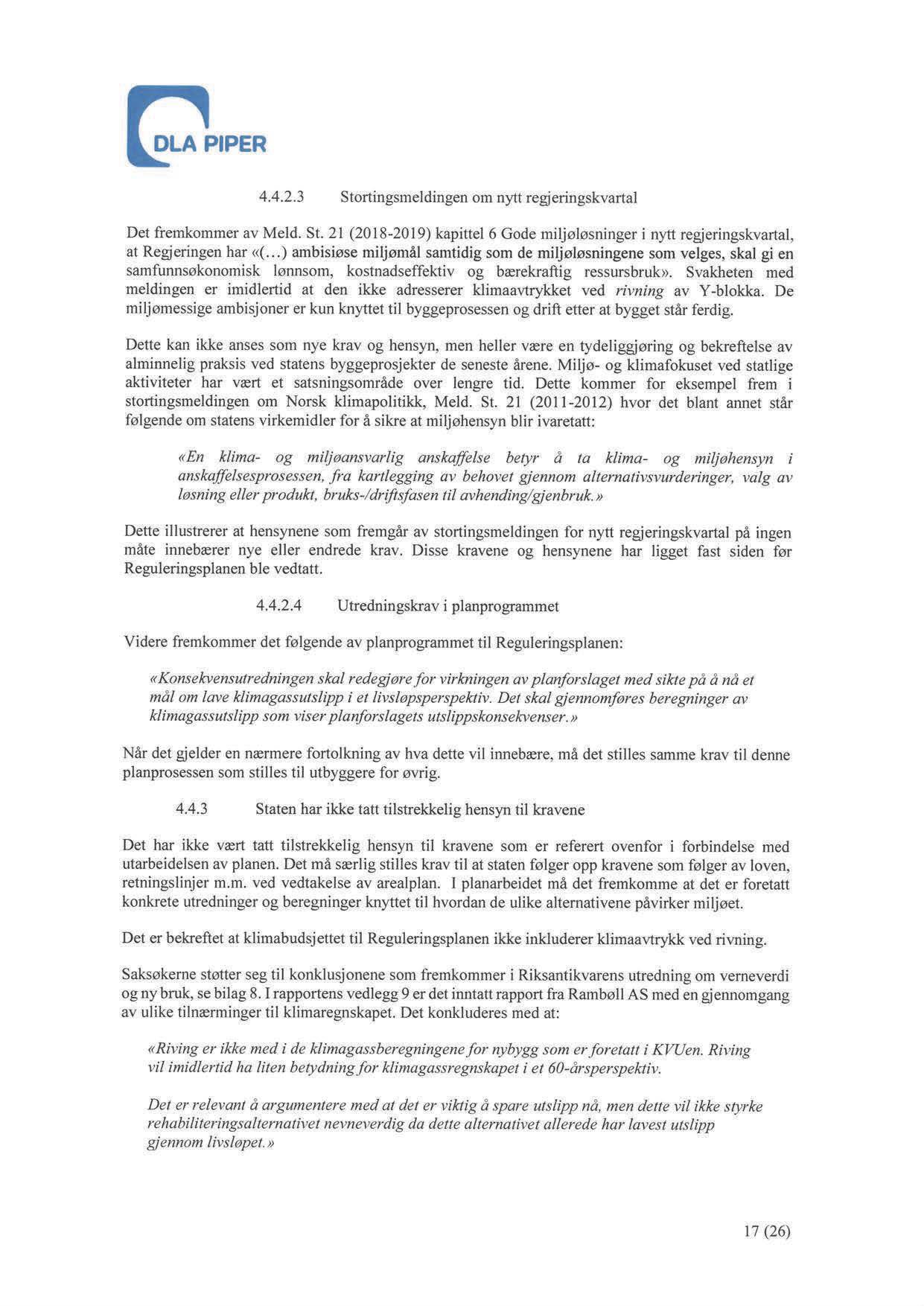 I Kommunal- og moderniseringsdepartementets vedtak av reguleringsplan 10. februar 2017 uttales følgende om riving av Y-blokka: