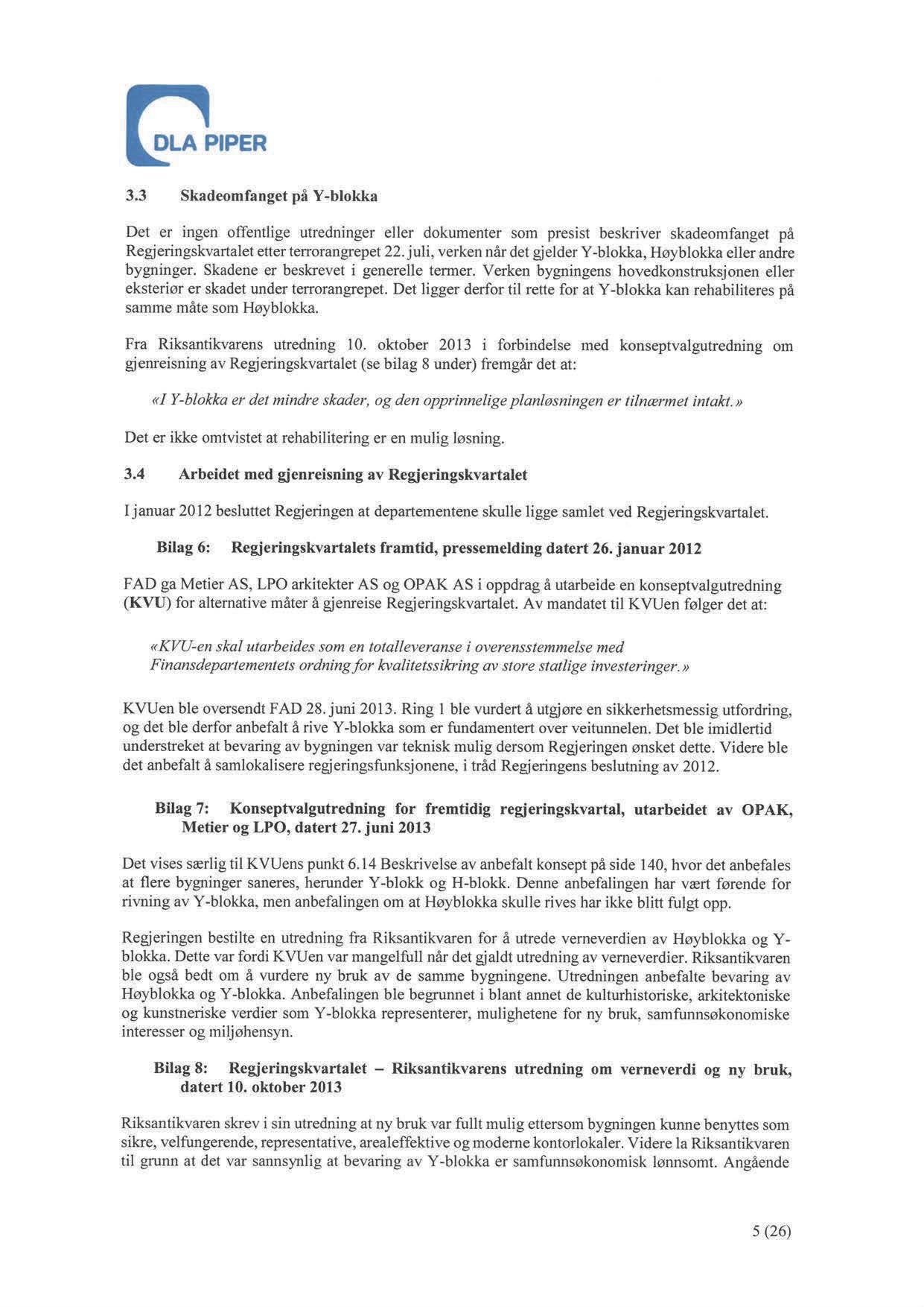 besluttet i mai 2014 at Høyblokken skulle bevares, og at S-blokken, R4 og Y-blokken skulle rives. Spørsmålet om bevaring og gjenbruk av bygningene i regjeringskvartalet ble drøftet både i konseptvalgutredningen og i den etterfølgende kvalitetssikringen. Det var både sikkerhetsmessige forhold og hensynet til mulighetene for å utvikle et effektivt og kompakt regjeringskvartal som lå til grunn for regjeringens beslutning om å rive Y-blokken. Verdiene knyttet til bygningene i regjeringskvartalet var på tidspunktet for regjeringens beslutning godt kjent, blant annet gjennom Fornyings-, administrasjons- og kirkedepartementets forslag til landsverneplan for regjeringskvartalet og Victoria terrasse (2010).