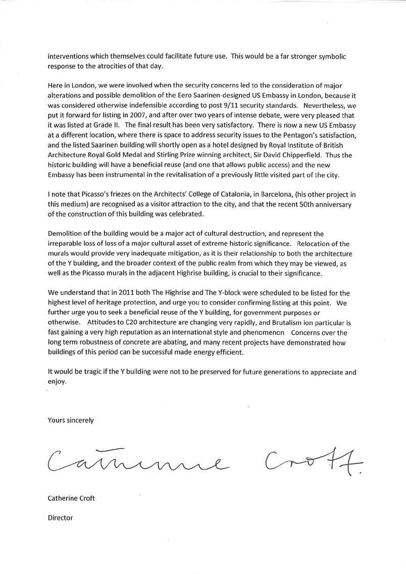 As you must be well aware, the “Y-Block” was designed by the notable Norwegian architect Erling Viksjø and incorporates two engraved murals authored by Pablo Picasso. The architectural merits of this significant example of European, brutalist architecture include the use of Viksjø’s “Naturbetong” technique. Picasso’s murals for the “Y-Block,” in many ways, signal the beginning of the artist’s celebrated works of monumental sculpture that can be found in cities like Chicago or New York. As such, the ensemble is a prime example of the notion of the postwar “synthesis of the arts” of the highest artistic standard. The demolition of the building complex would not only constitute a significant loss of Norwegian architectural heritage, but it would also render any attempt to salvage or reposition Picasso’s site-specific murals elsewhere unfortunate, as any of these approaches would seriously distort the artist’s intentions.