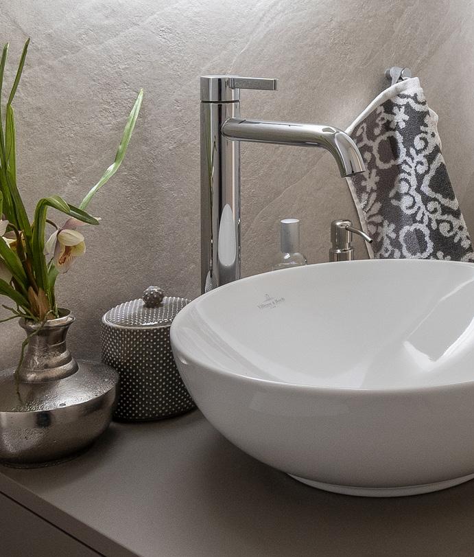 Grosszügige Duschen und Badewannen, Glastrennwände, Waschtische, Unterbaumöbel, Spiegelschränke und Wandklosett machen die Nassräume komplett.