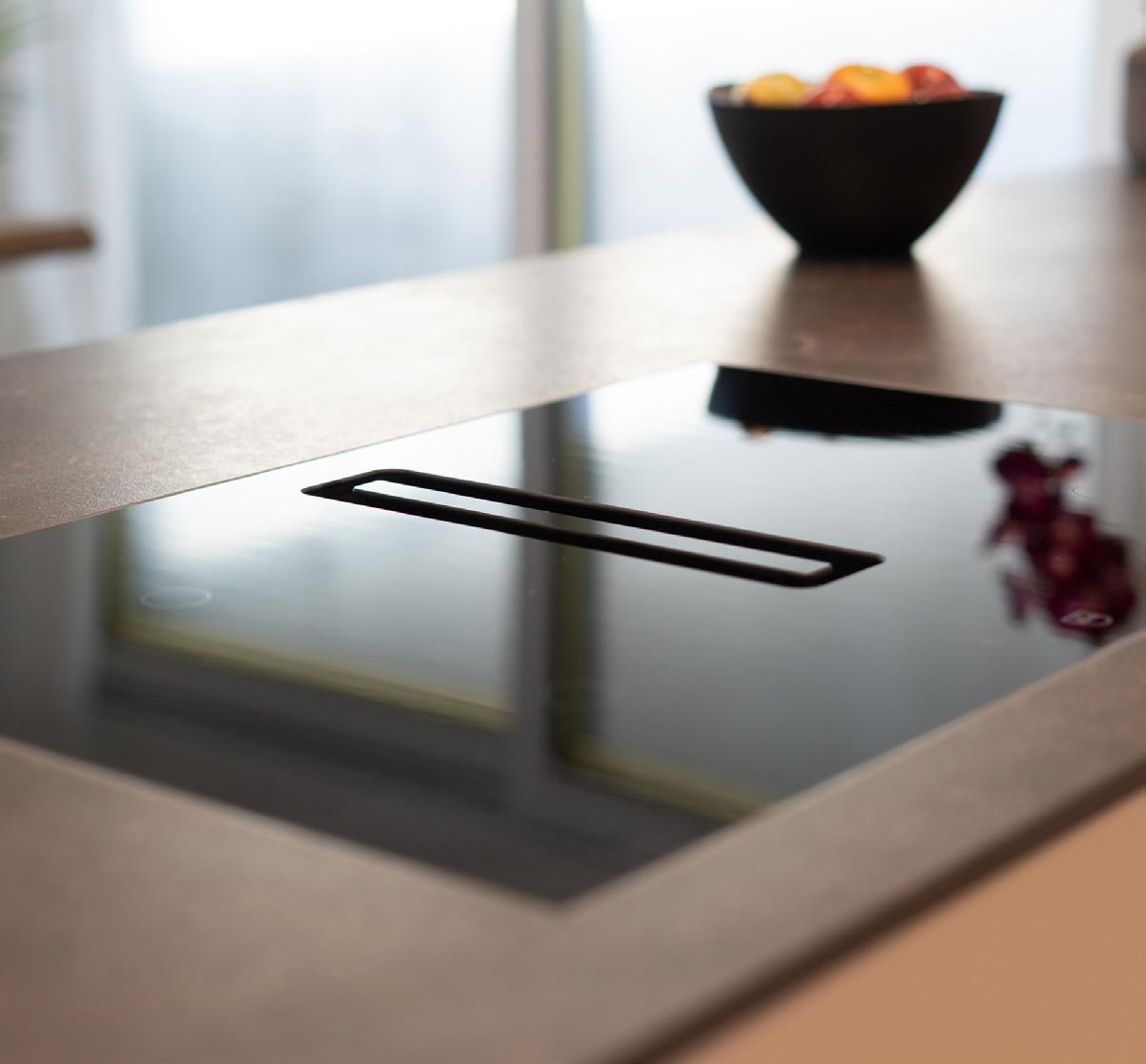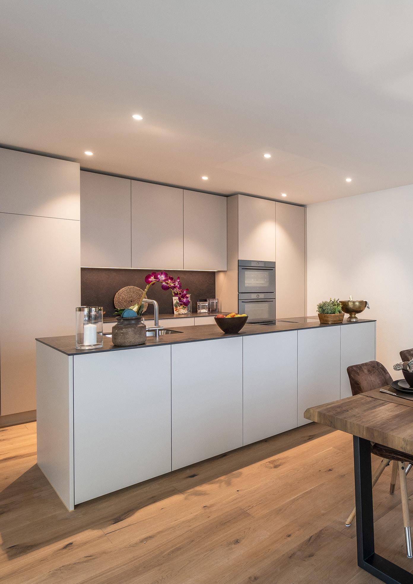 Die Küche bietet zahlreiche Ober- und Unterschränke, Arbeitsflächen und Rückwände aus Granit, hochwertige Geräte wie Steamer, Backofen, Geschirrspüler, Induktionskochfeld mit Muldenlüfter, Edelstahlbecken sowie Deckeneinbauspots und LED Beleuchtung unter den Hängeschränken.