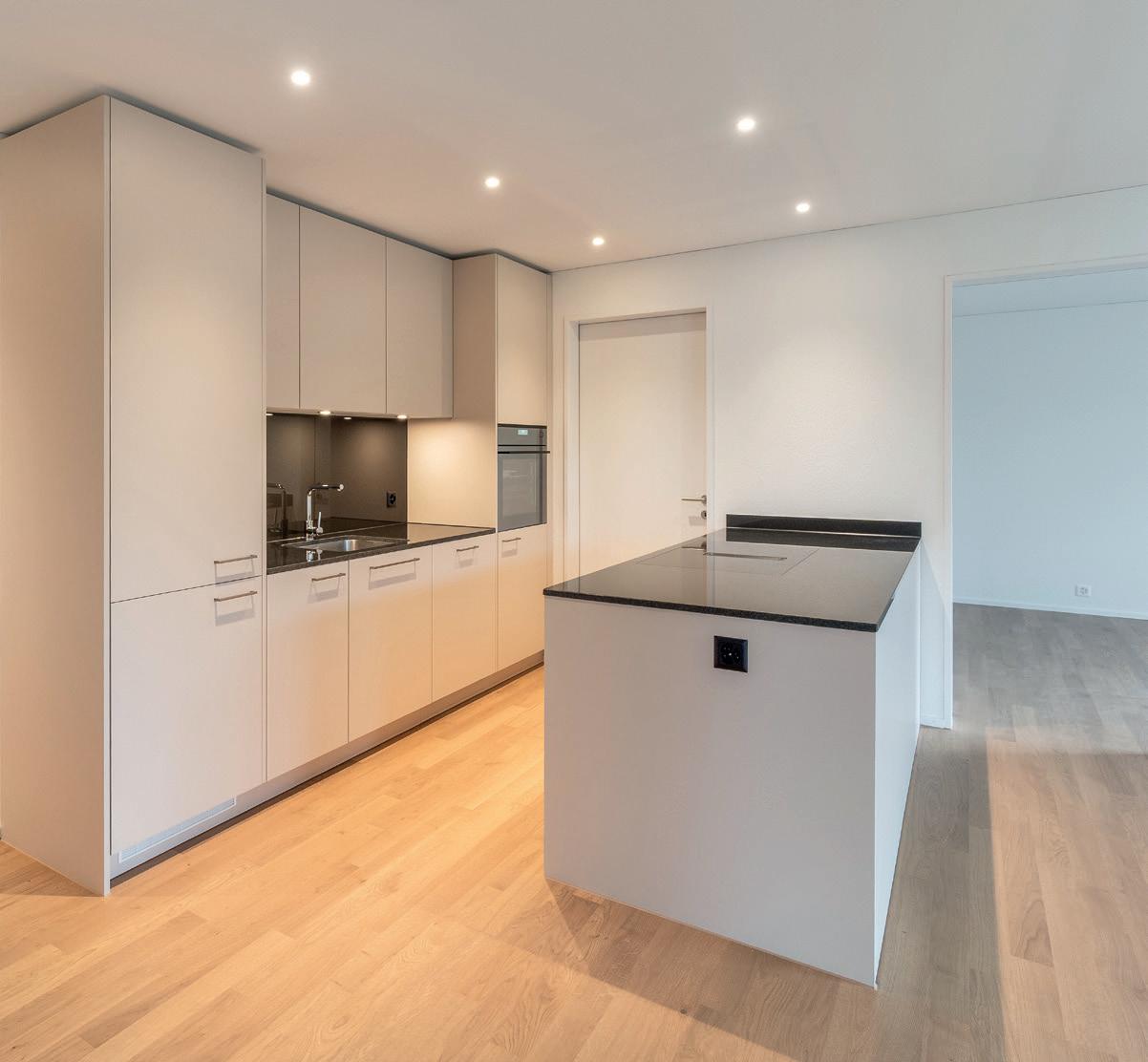 Die Küche bietet zahlreiche Ober- und Unterschränke, Arbeitsflächen aus Granit, hochwertige Geräte wie Kombi Steamer/ Backofen, Geschirrspüler, Induktionskochfeld, bei den Kochinseln mit integriertem Kochfeldabzug, Edelstahlbecken sowie Deckeneinbauspots.