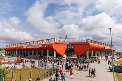 Das altehrwürdige, aber doch ziemlich in die Jahre ge kommene Wildparkstadion des KSC, mitten im Karlsruher Hardtwald, wurde 2018 nach und nach abgerissen. An derselben Stelle entsteht seit jeher der BBBank Wildpark, eine moderne Fußballarena, die bei Fertigstellung Platz für 34.100 Zuschauer bieten soll. Das Stadion nimmt immer weiter Formen an. Die Süd-, Ost- sowie Nordtribüne sind bereits für die Zuschauer freigegeben. Aktuell stehen noch die Fertigstellung der Haupttribüne – inklusive neuer KSCGeschäftsstelle – sowie der Lückenschluss auf der SüdWest-Seite an. Beim KSC rechnet man mit einem Ende der Bauarbeiten im Jahr 2023.