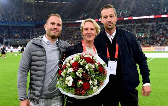 Während des Heimspiels gegen Rostock wurde Martina Voss-Tecklen burg unter anderem für Ihre Erfolge als National trainerin vom Aufsichts ratsvorsitzenden Björn Borgerding und seinem Stellvertreter Sebastian Fuchs geehrt. Jetzt wird sie Düsseldorfs Botschaf terin der EURO 2024.