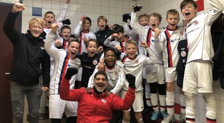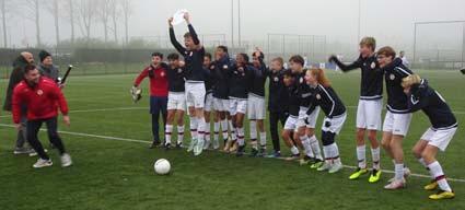 We waren compleet en mochten op veld A spelen op de grijze koude middag. De wedstrijden die hiervoor op dit veld gespeeld werden waren allen in overwinningen voor Fortuna omgezet, dus alle ingrediënten waren aanwezig om ook onze Tijgers wellicht de 3 punten in de zak te laten steken. Tussentijdse tekst valt te lezen op de website. Met nog een paar minuten te spelen begon de spanning langzaam op te lopen, niet bij de spelers, want die hadden nog geen idee, maar zeer zeker wel bij de begeleiders van dit team en bij het eindsignaal sprongen deze dan ook in elkaars armen, het onmogelijke is gewoon gebeurd…………… JO13-2 is KAMPIOEN in de Hoofdklasse en het feest kon worden gevierd.
