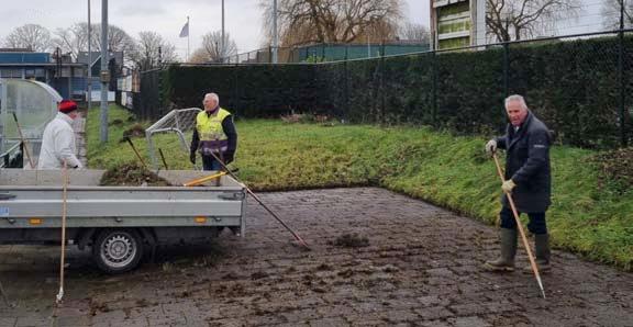 In dit geval een trio zwoegers dat bezig is het onkruid te verwijderen langs de zijlijn van het C-veld. Een klus die de werkers Nico, Rene en Gerard de nodige energie kost. 'Toch moet je het bijhouden. Anders is er straks geen doorkomen meer aan.'