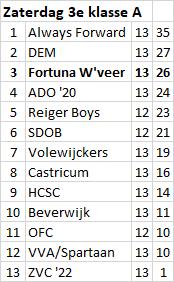 In de derde klasse A van het zaterdagvoetbal is vanmiddag duidelijk geworden dat Always Forward voor de concurrentie duidelijk een maatje te groot is. Dit keer een strijd van de mannen uit Hoorn tegen die jongens uit Wormerveer. Na een 0-3 rust uiteindelijk een 'soort van' eervolle 0-4 nederlaag. En Always Forward alvast gefeliciteerd met de titel.