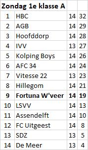 Zondag 1: Goed spelen en toch met 1-4 verliezen…. De uitdrukking ‘geflatteerde nederlaag’ komt met de regelmaat van de klok voorbij in ook de voetbalwereld. Zondag 1 heeft dat aan den lijve ondervonden tegen Hoofddorp. Natuurlijk de nr 3 op de ranglijst, maar Fortuna was beslist niet minder. De ploeg van trainer Jorg Smeets wist echter optimaal gebruik te maken van de kleine mogelijkheden die geboden werden.