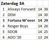 In de competitie werd in de derde klasse A werd door twee directe concurrenten gespeeld: SDOB-Reiger Boys met als eindstand 5-3. De Top 6 is nu als volgt: