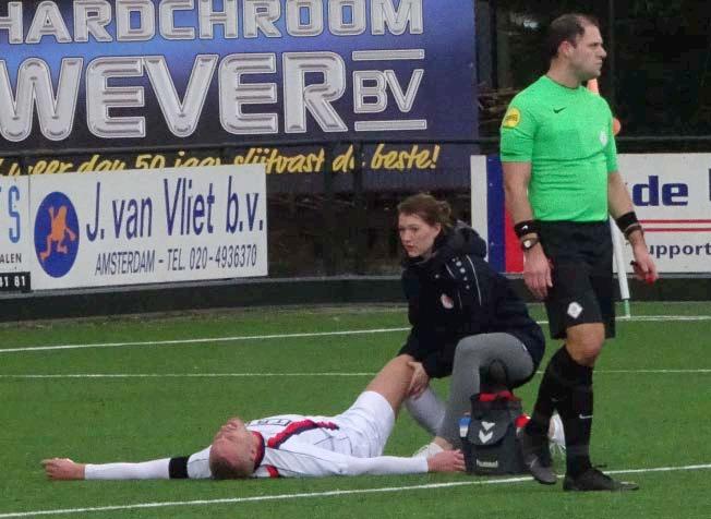 vergeten mee te nemen. Dat verklaart wellicht meteen waarom de man tijdens de wedstrijd minder floot dan menigeen op de tribune verwachtte? Want bij de overtreding op Jordi - net buiten de 16 en dus beslist geen pingel - was een fluitsignaal m.i. op zijn plaats geweest en misschien zelfs wel een rode kaart. Enfin dat gebeurde allemaal niet en de arme Jordi moest naar het ziekenhuis worden vervoerd. Daar konden ze helaas nog geen onderzoek doen. De kanjer moet woensdag terugkomen in de hoop dat de zwelling dan minder ernstig is. Hij verliet het ZMC op krukken en met een drukverband. Vanaf deze plaats in ieder geval een voorspoedig herstel toegewenst.