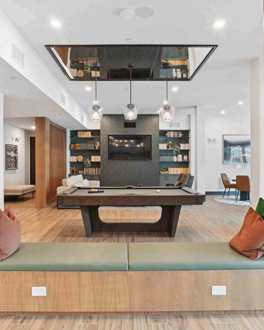 Residents enjoy a courtyard, dog park, community library, fitness center, a lounge, a business center, and other luxury amenities.